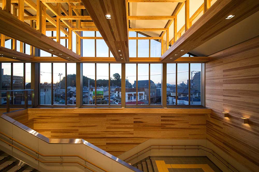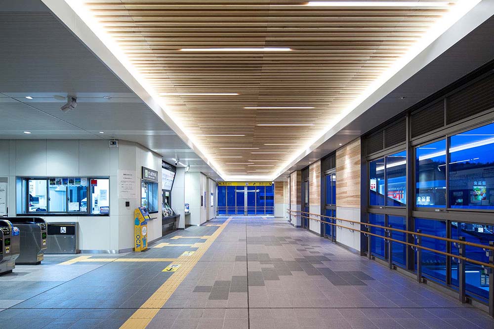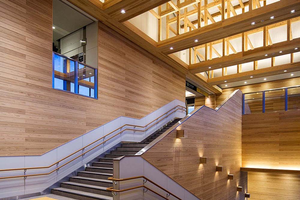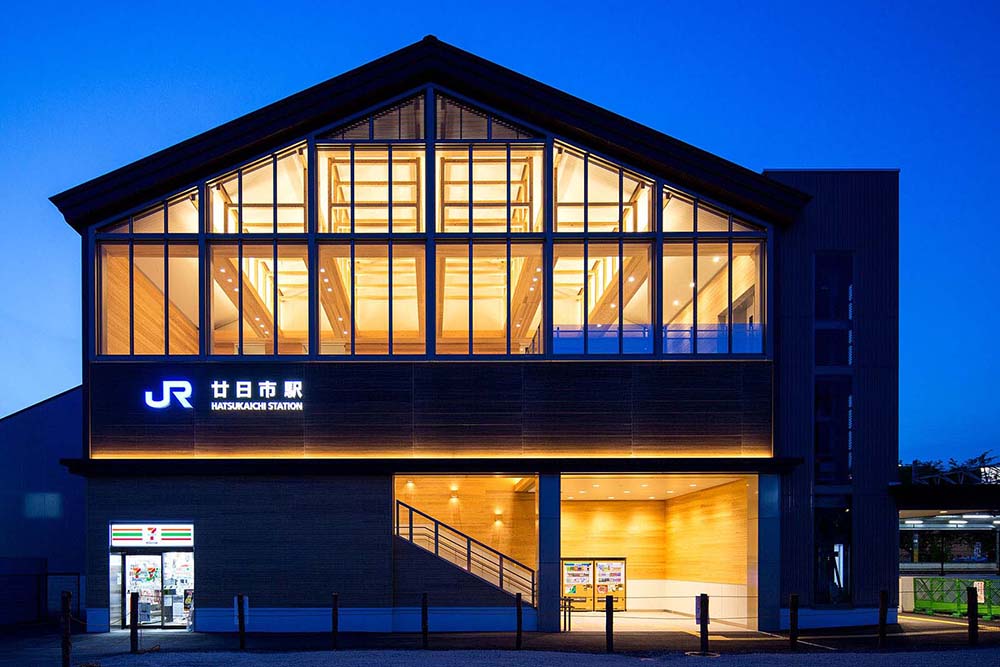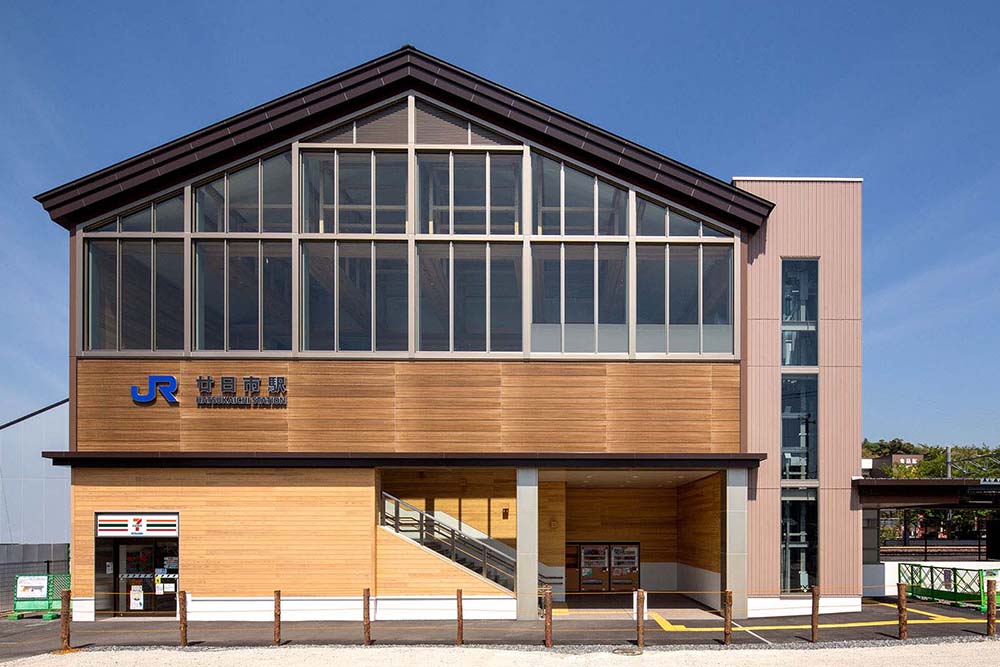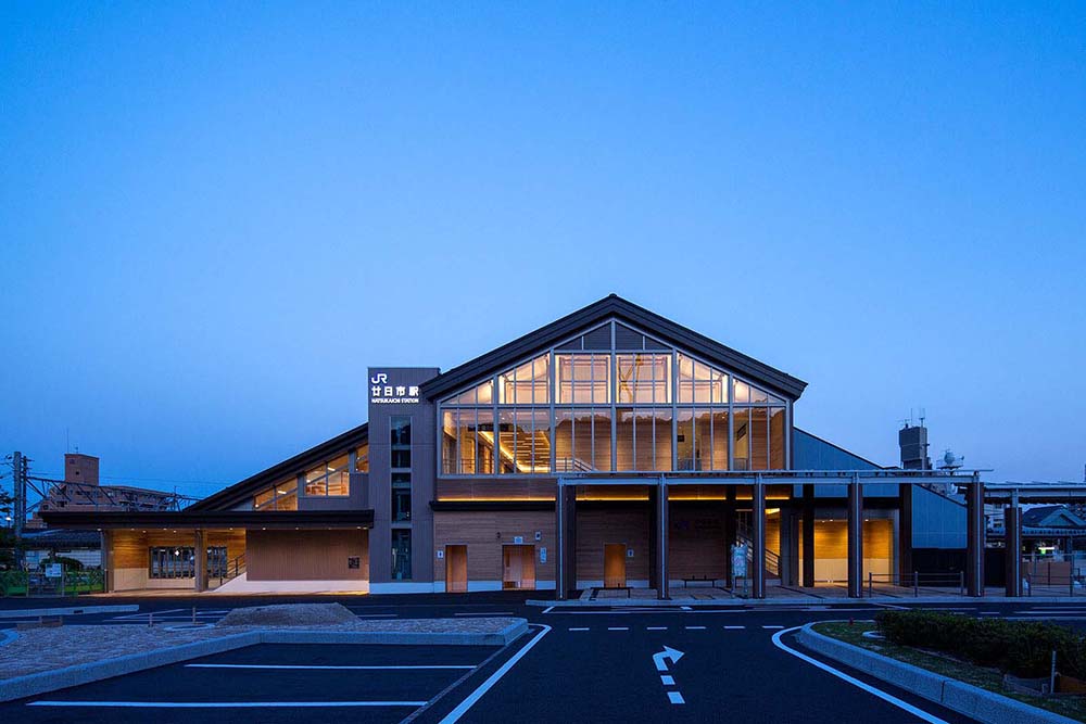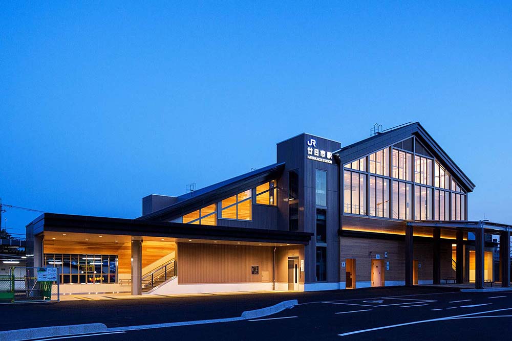 廿日市駅は広島県西部に位置する山陽本線の駅であり、駅前広場整備、自由通路、橋上駅舎の建設を行った。厳島神社、木材をデザインキーワードとして、木の素材感がベースとなり、地形や歴史のイメージを想起させるデザインとなっている。地場産の木材をふんだんに使用し「木のまち廿日市の玄関口」にふさわしく、地域性を大胆に表現した。