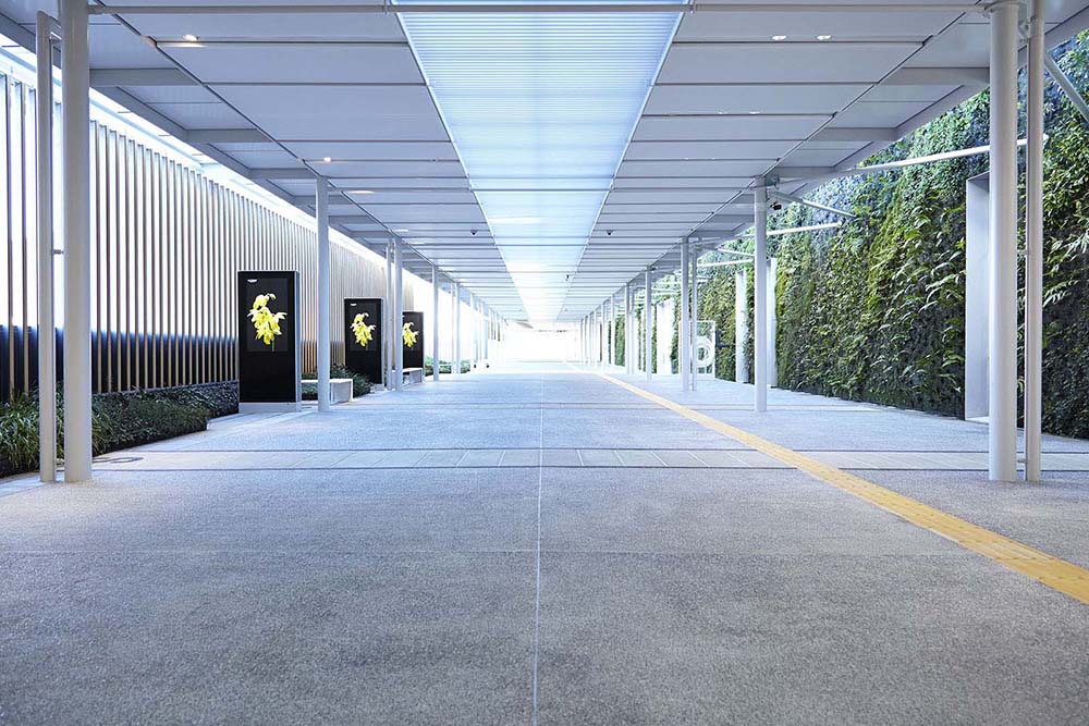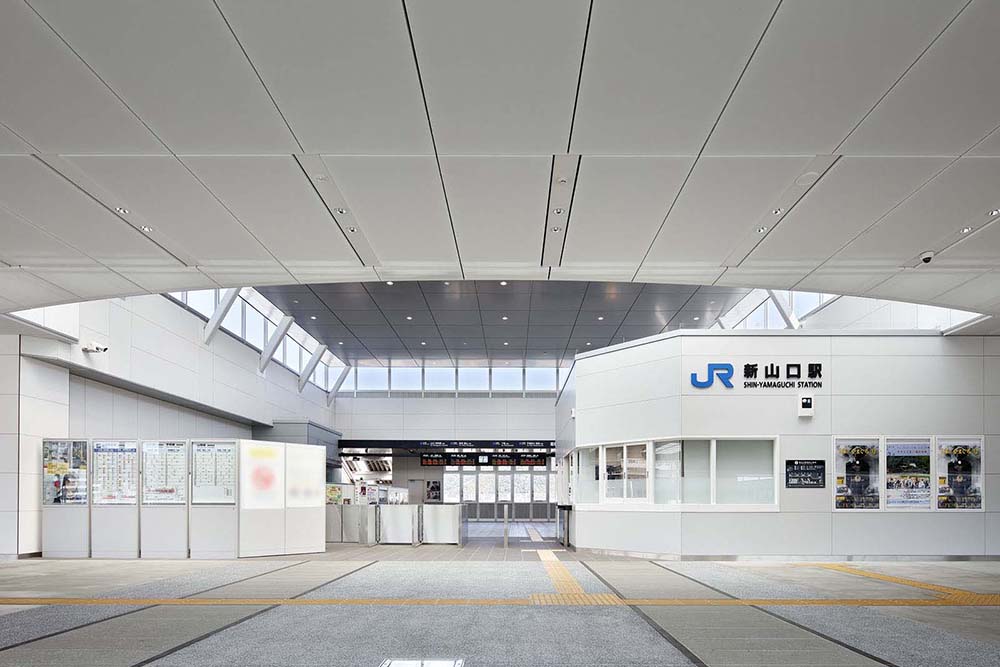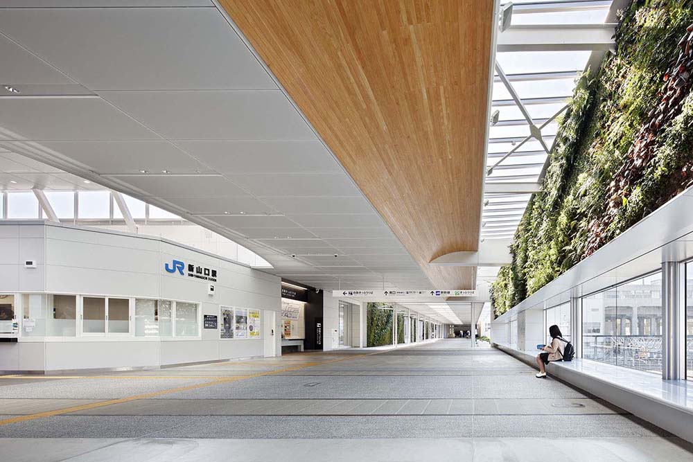 自由通路は山口に自生する約140種の植物による「垂直庭園」やベンチを配置、一部天井やルーバーには地場産の檜材を採用し、自然豊かな山口市の新しい魅力を発信する空間とした。床面には自由通路下部の線路・ホームを投影したデザインを施し、SLが発着するホームにはレトロ調のタイル・照明などの趣向を凝らし「鉄道のまち」を表現した。