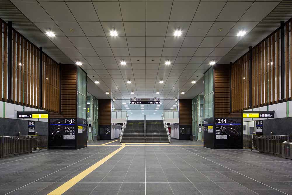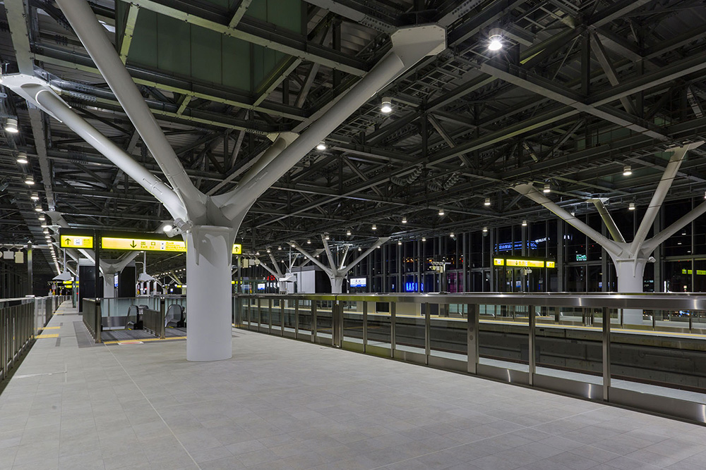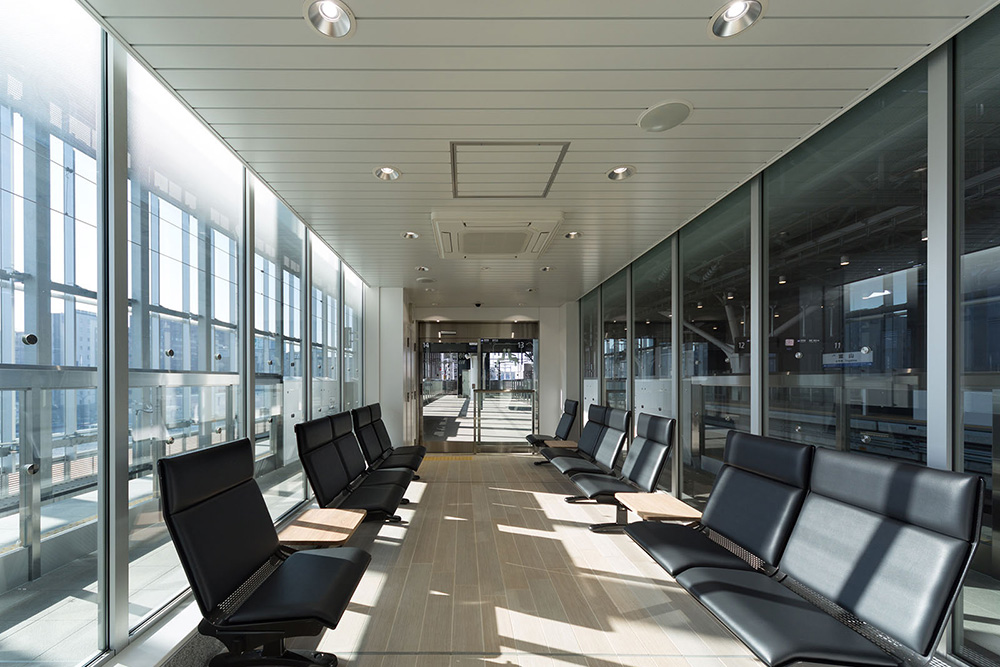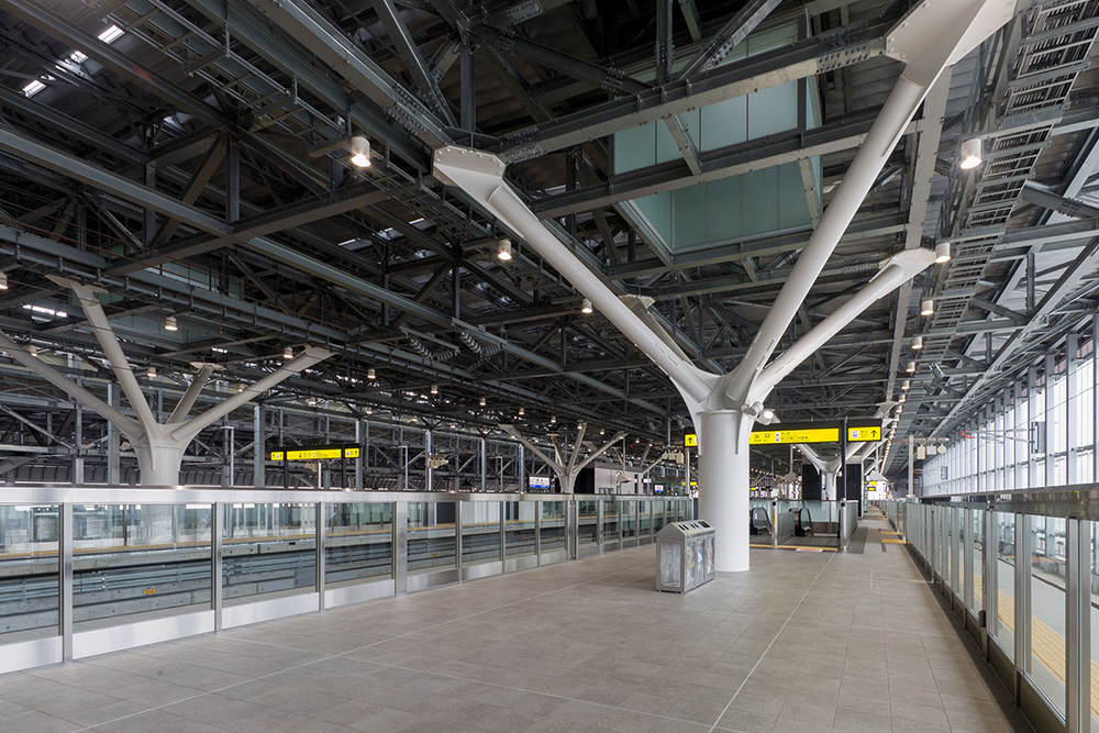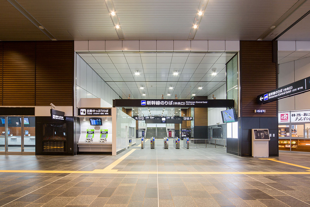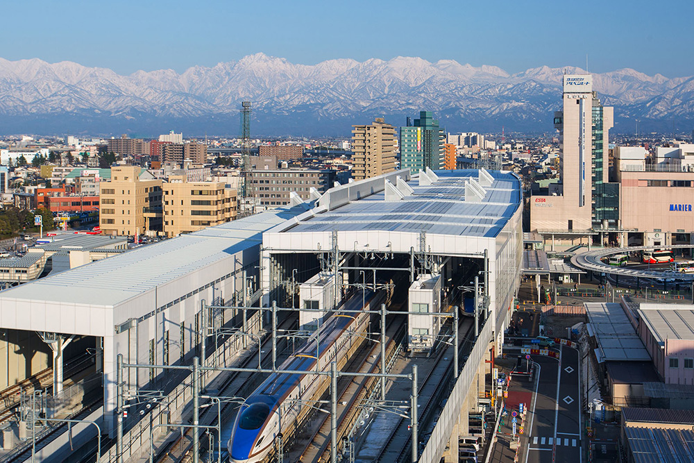 北陸新幹線富山駅は地上3階建ての高架下駅で、デザインコンセプトを『立山あおぎ 心ときめく 光の舞台』とし、ホームの四つ又に分かれた白い柱を雪の立山杉の木立に見立て、大きなガラススクリーン越しにドラマチックに見せている。またコンコースの一部には八尾和紙を取り入れており、型染めによる様々な和紙の表情を楽しむことができる。