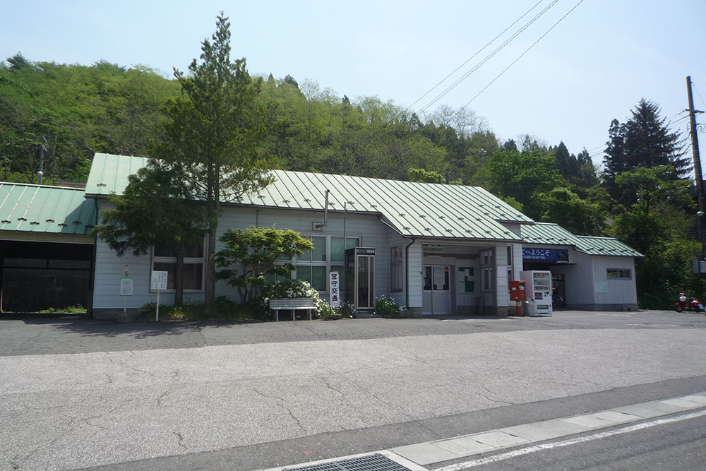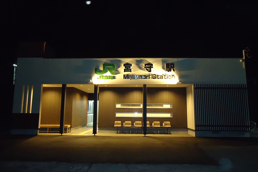 宮守駅のある釜石線はSL銀河の停車駅となっており、既存駅舎の経年による老朽化や無人駅となったことから、コンパクト化を行った。本駅は駅本屋とホームとは約5m程の高低差がある為、ホーム上からの景観にも配慮し、塔屋をデザインとして取入れ、外装にはSL銀河の撮影スポットとして知られている眼鏡橋の景観や、宮沢賢治の世界観を連想させられるよう、レンガ調タイルと左官調に仕上た吹付け仕上げを組合せ、地域の顔として周辺環境と一体となった駅となるよう心がけた。