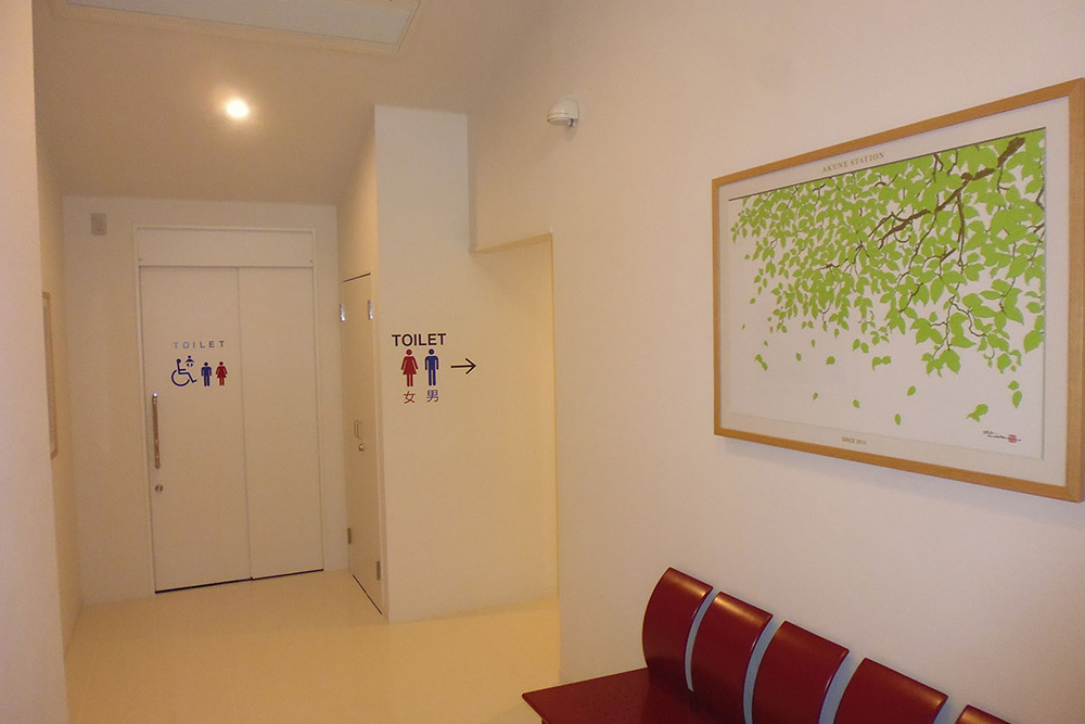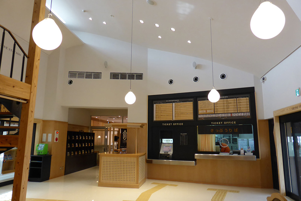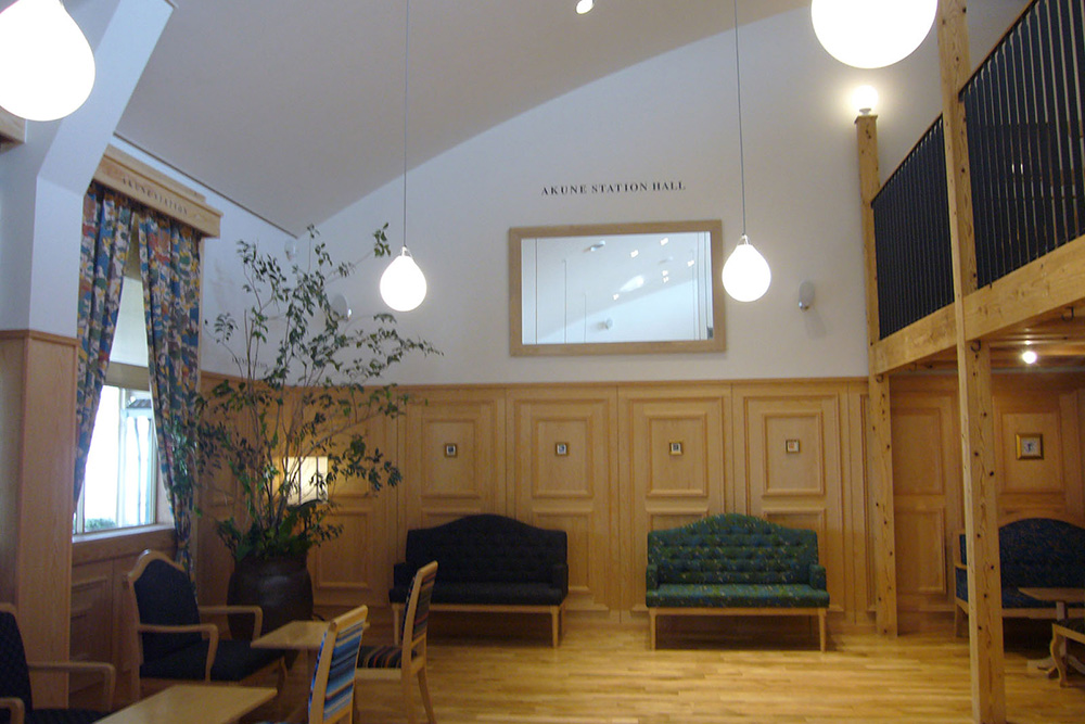 築65年の木造駅舎が、『にぎわい交流館 阿久根駅』として甦りました。市民と観光客の交流と賑わいが生まれる様に、多目的に使用できる待合室を始め、カフェ、図書コーナー、キッズスペース等を設置しました。内装には、木質系の仕上げ材を多用しモダンで上品ではあるが、明るく、あたたかく、どこか懐かしさも感じさせる駅に生まれ変わりました。
