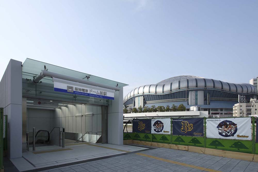 阪神なんば線は平成21年3月20日に開通した新線です。ドーム前駅は「懐かしさと新しさの融合」をテーマとし、地域の特徴にあわせた個性的なデザインとしているほか、乗り換え利便性に優れています。また、地下空間において、ダイナミックな吹き抜けを設けるなど、見通しを良くしており、より快適にご利用いただけるよう工夫しています。