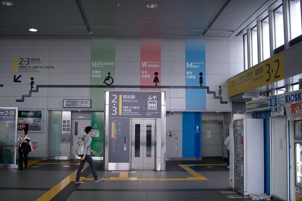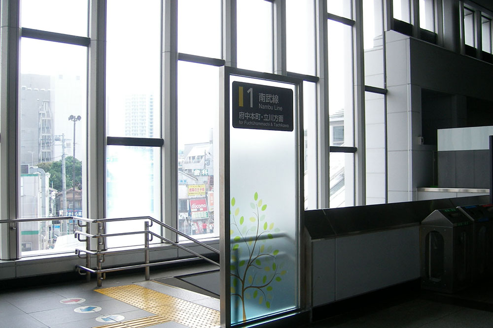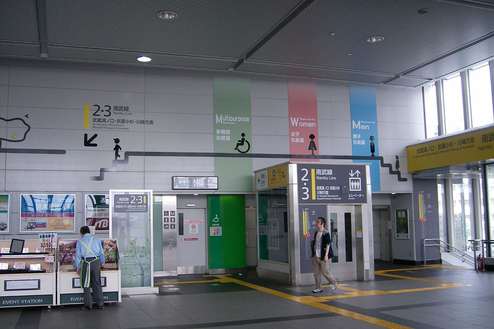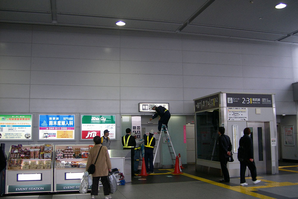 今後の人口増加が見込まれる地域に位置するJR南武線登戸駅において、駅をご利用になるお客さまの利便性の一層の向上を図るため、既存案内サインの課題を整理・検討した。整理された課題に対し、既存壁面を利用した大型案内サインを新設することで、案内サイン自体の視認性を向上させ、利便性向上につなげる改良工事を行った。