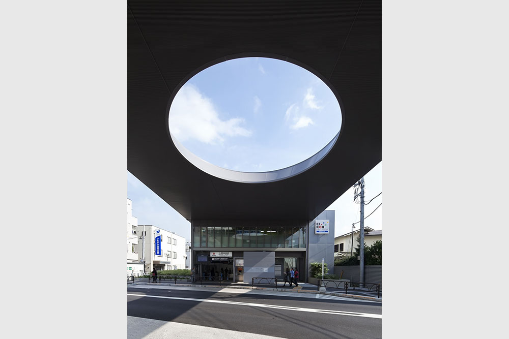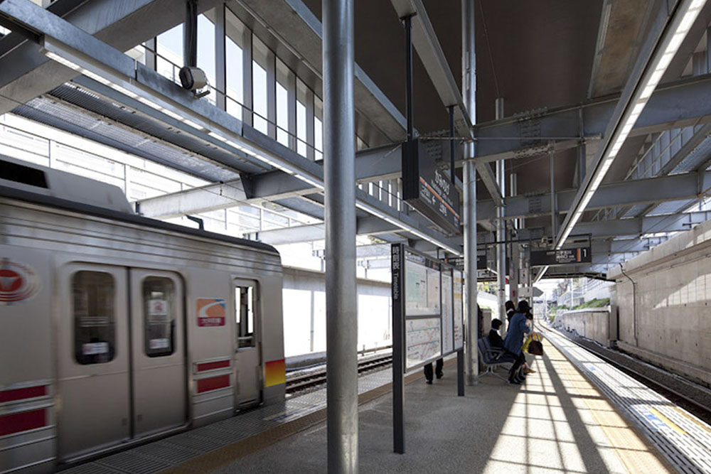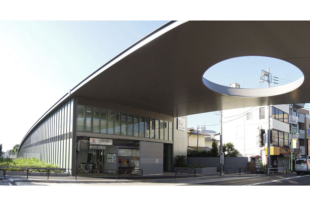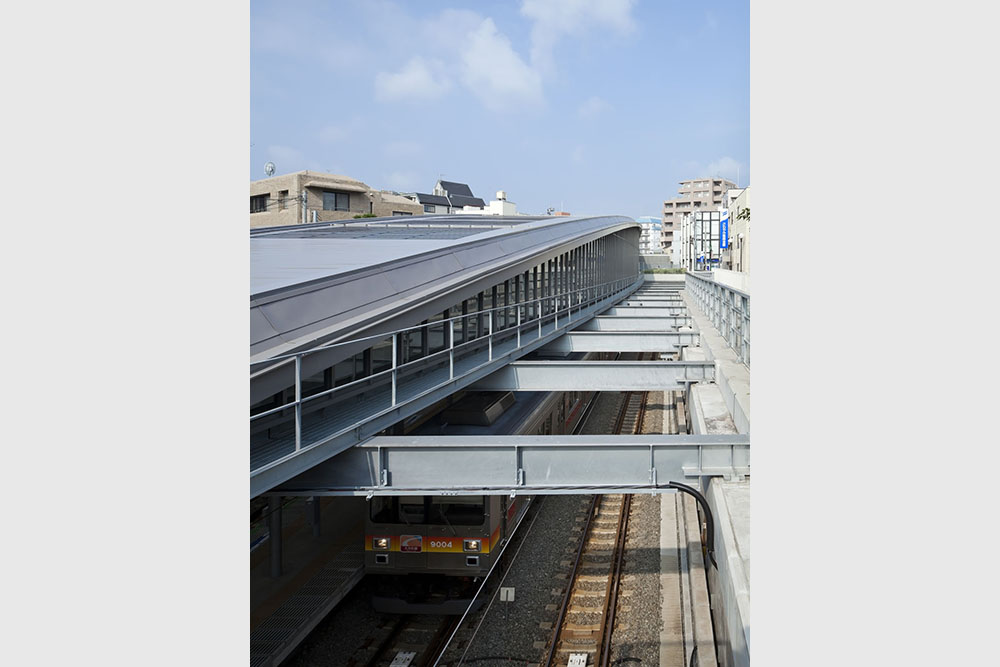 大井町線上野毛駅の急行通過線設置工事及びバリアフリー化を含む駅舎の機能拡充計画である。鉄道敷が掘割となっており、プラットホーム上部を一般道路が横切る上野毛駅の立地特性に対し、道路を挟んで配置される駅、バス停等を道路ごと大屋根で覆う計画とした。多様な交通網を一体化することで、地域の”顔”となる駅前風景の創出が意図されている。
