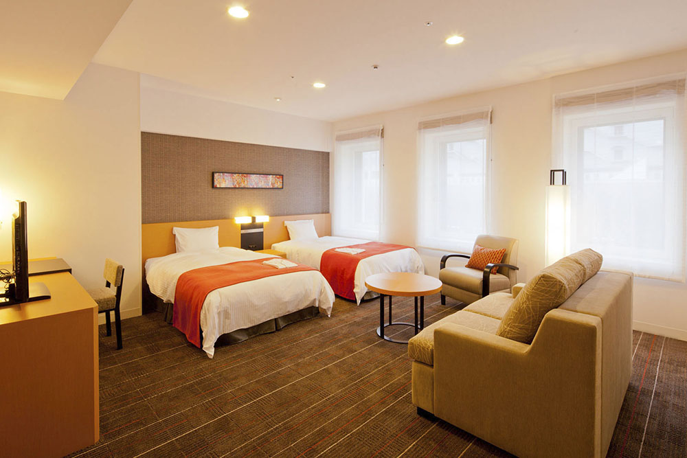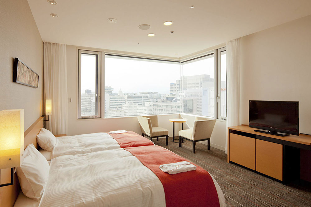 ホテル近鉄京都駅は「駅直結・駅直上」の抜群のロケーションを誇り、客室はコンパクトで機能的な中にも落ち着きのあるツインルーム中心の構成で全室トレインビューである。中でも西側のコーナーツインルームは、2面に大きな窓を設け、京都駅を発着する新幹線・JR在来線・近鉄線の列車を眼下に見ることができ、お客様を楽しませている。