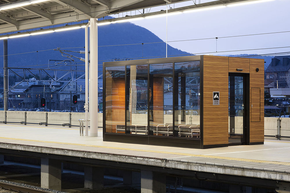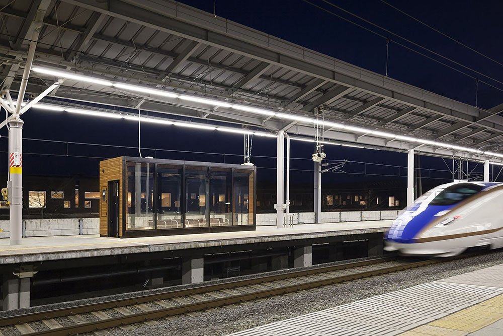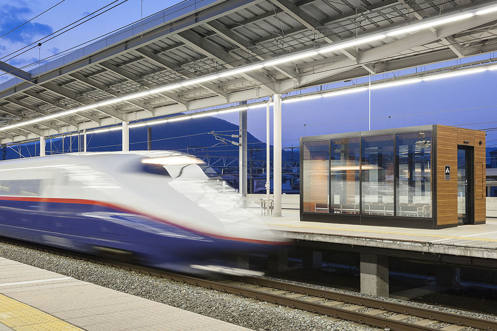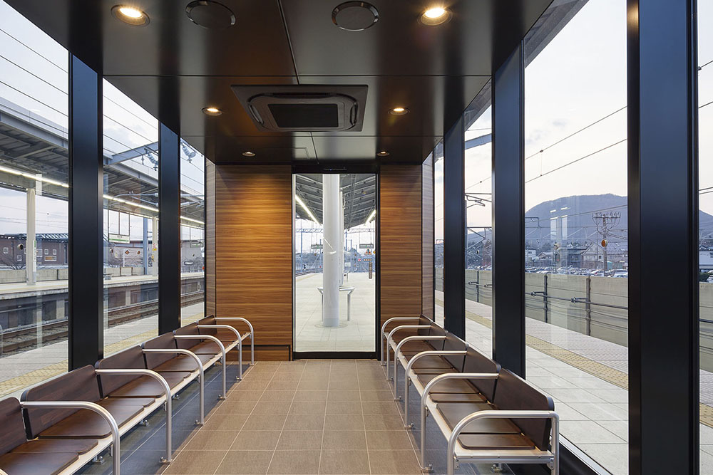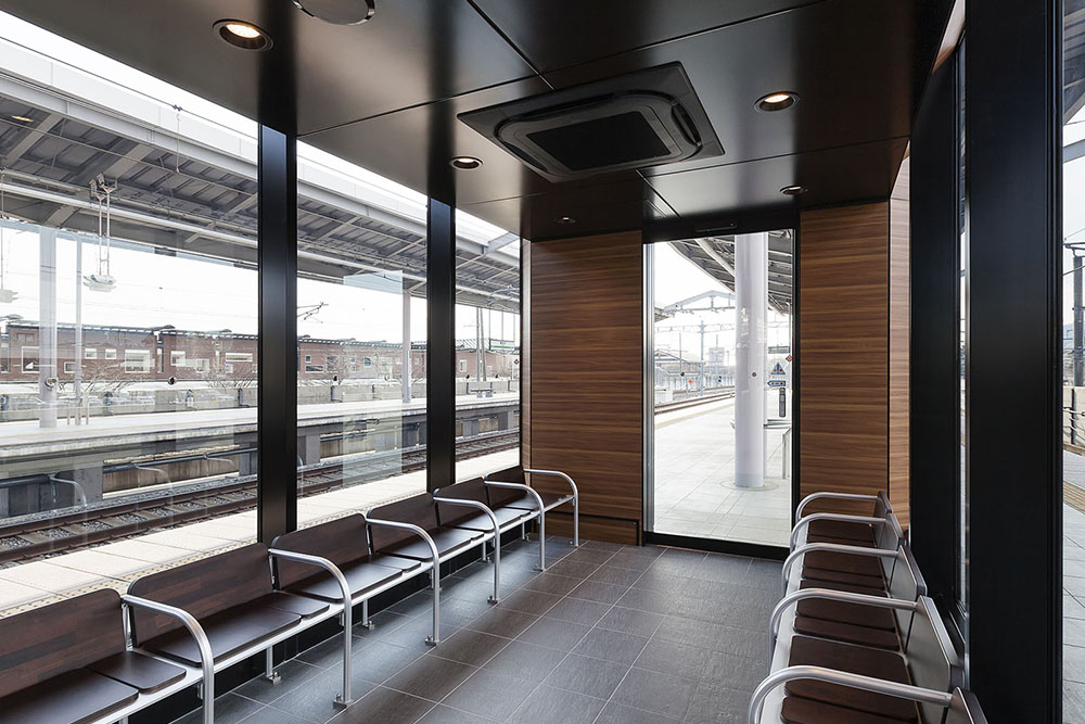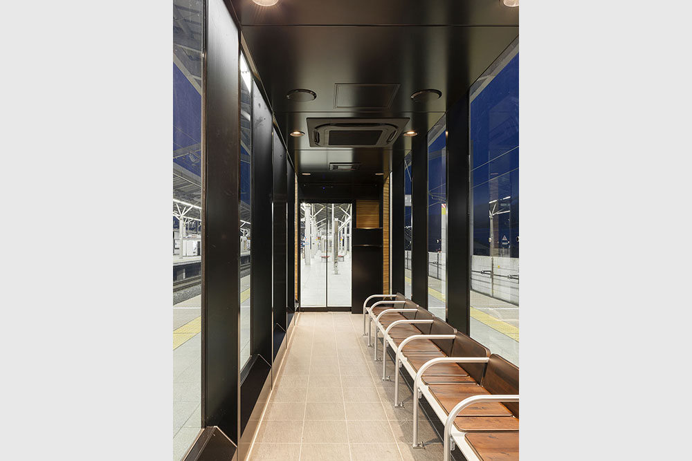 H26年3月にデビューしたE7系新幹線に併結されるグランクラス・グリーン車のお客さまをメインターゲットとした待合室を軽井沢駅のホームに整備した。現場施工期間の短縮を図るためアルミ合金造ユニット式待合室を採用しながらも、仕上げ材やディテール等を丁寧に検証し、軽井沢駅にふさわしい意匠を実現している。