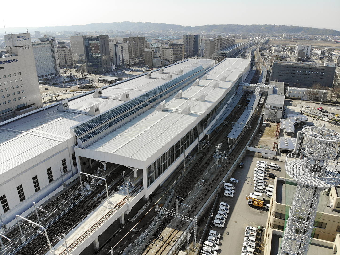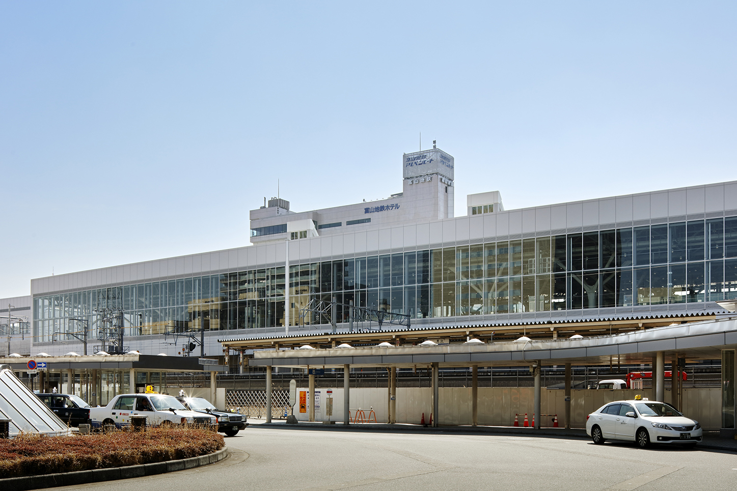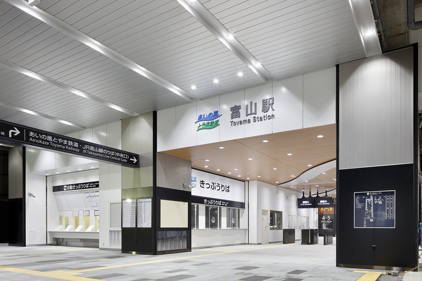 富山駅は自由通路およびLRT南北接続を含む連続立体交差事業の一環として高架化された。新幹線駅と共通の「立山あおぎ 心ときめく 光の舞台」をコンセプトに、縦ラインと白を基調としたファサード、立山杉に見立てた全覆い上家の柱を設えた。ホーム階はあいの風とやま鉄道線と新幹線との間に壁を設けないことで一体的な空間を構成した。
