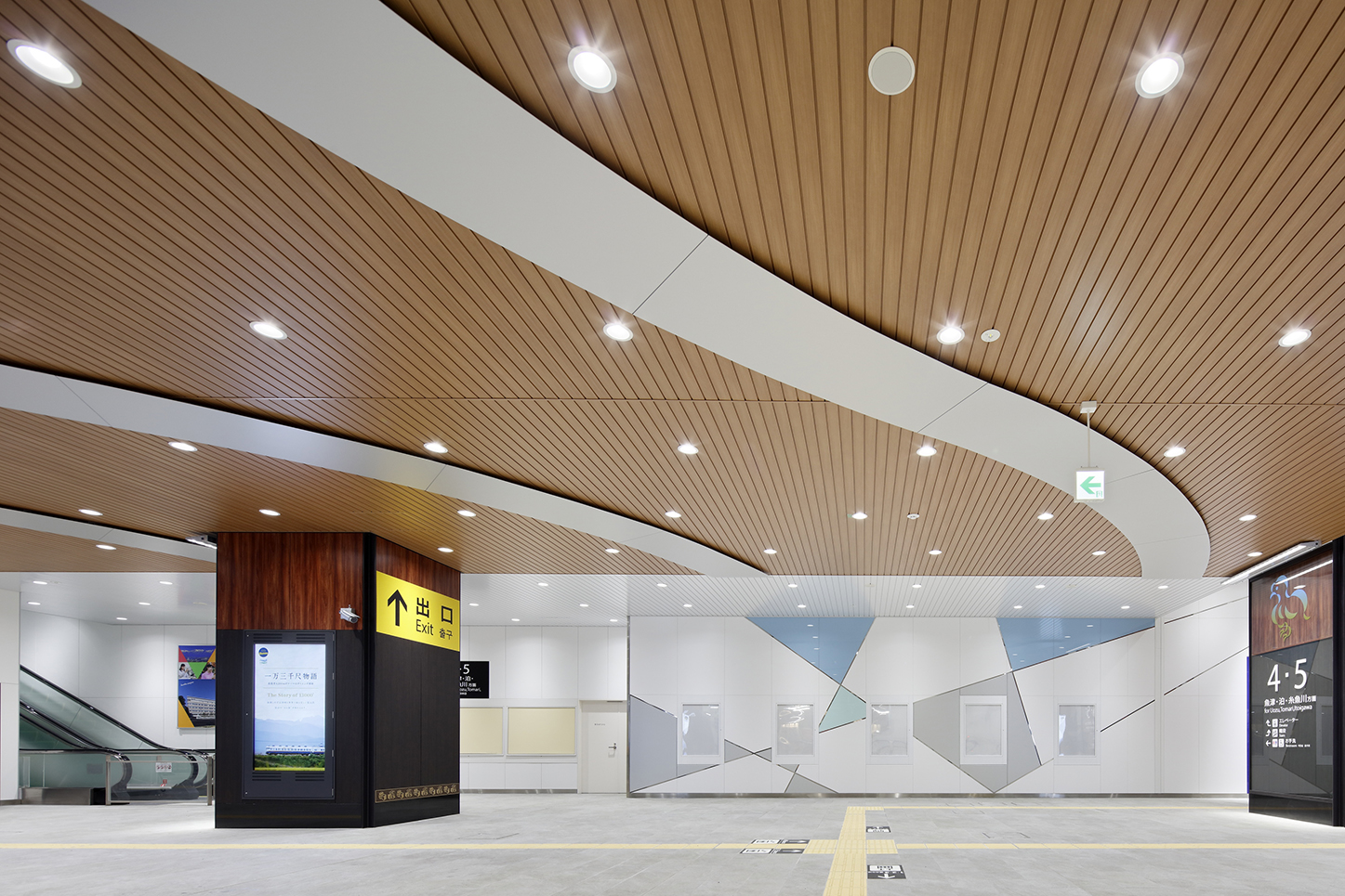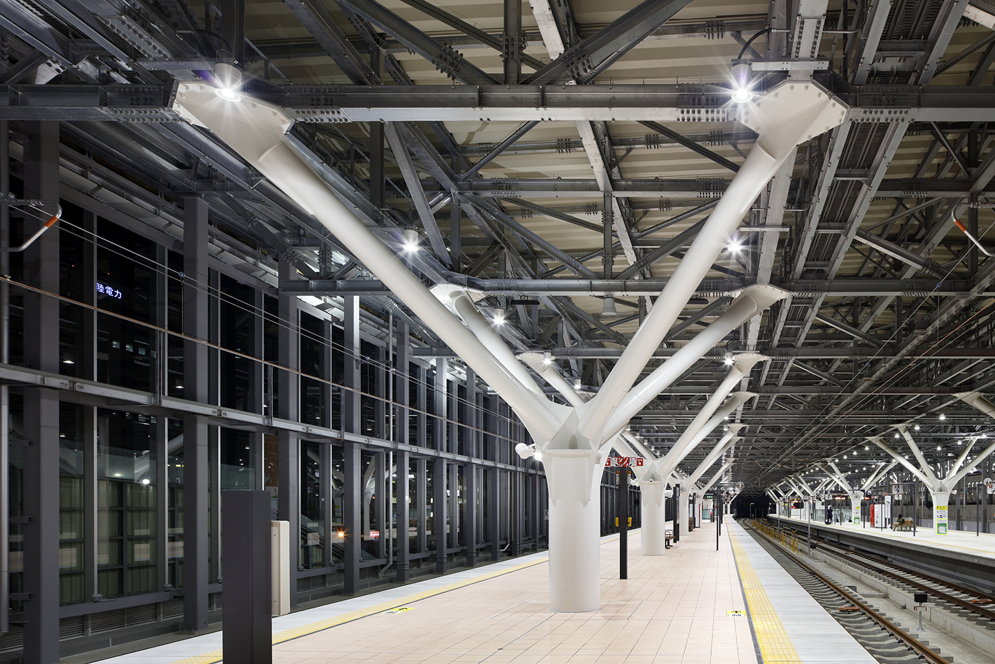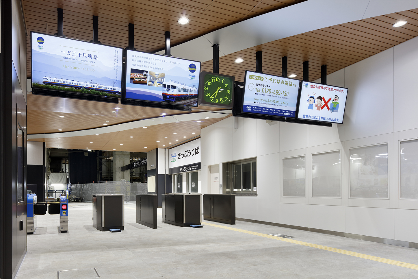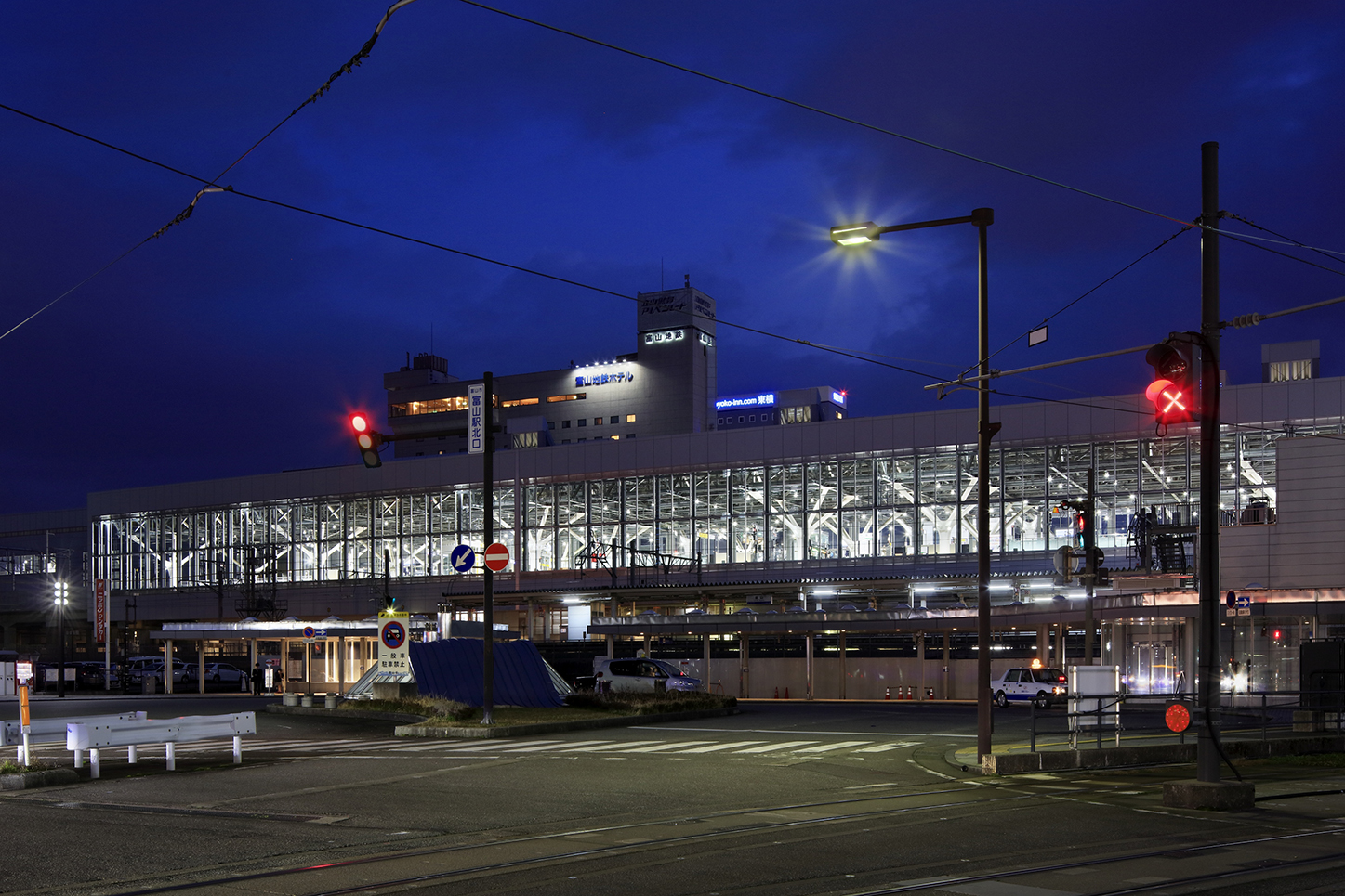 富山駅は自由通路およびLRT南北接続を含む連続立体交差事業の一環として高架化された。新幹線駅と共通の「立山あおぎ 心ときめく 光の舞台」をコンセプトに、縦ラインと白を基調としたファサード、立山杉に見立てた全覆い上家の柱を設えた。ホーム階はあいの風とやま鉄道線と新幹線との間に壁を設けないことで一体的な空間を構成した。