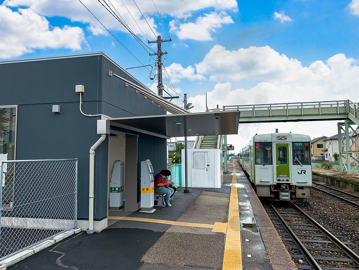 「地域に愛される駅舎」を目指し、地元の小学生と共に駅舎の建て替えを行った。地元の有名な“冬に咲く桜”をモチーフにし、一本の木に子供たちの手形を押して桜を咲かせたものを駅舎正面のデザインにしようと考え、「ハッピーフラワープロジェクト」を立ち上げ、地元の小学生160名とワークショップを実施した。