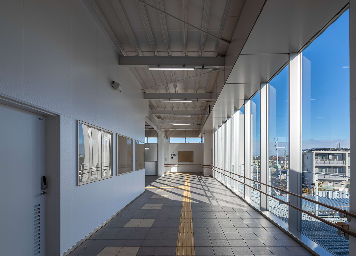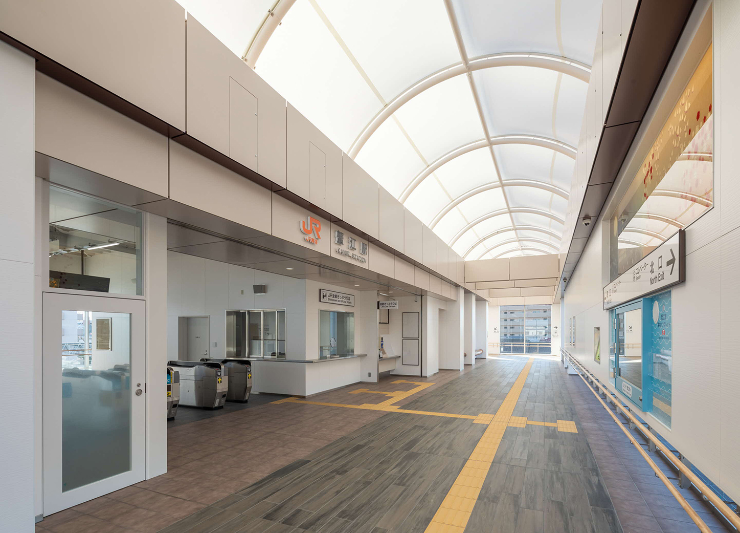 蟹江町で400年間行われている伝統行事「須成祭(ユネスコ無形文化遺産)」をデザインに取り入れた。夜間に屋根全体が提灯のように浮かび上がるように、屋根に膜材を用い、内部の照明光を外部に柔らかく透過させた。巻藁船(木船)をイメージし、外壁は茶色系で統一するとともに、内部の床は甲板を模した木目調のタイルで仕上げた。