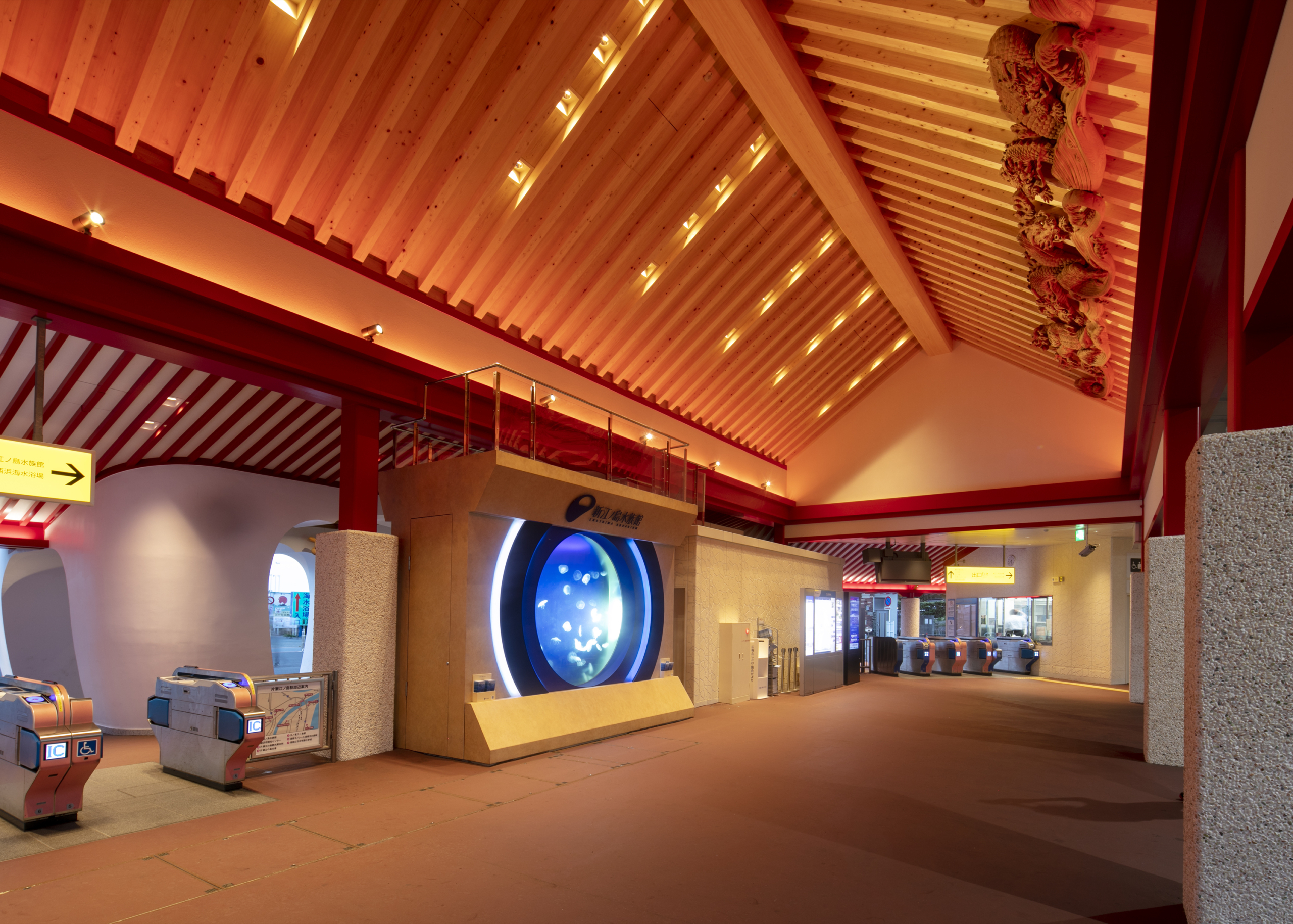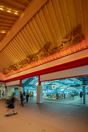 旧駅舎建設から90年間、「竜宮城」として地域の方々や観光客の皆さまに親しまれてきた駅のイメージを壊さずにより親しまれるよう、遊び心と品格を備えた改修内容とした。神社仏閣技法を採り入れ竜宮城らしさを踏襲、地元水族館と協同し駅構内にクラゲ水槽の設置、地元県産材を多用した温かみのある構内空間の創出などを実現している。