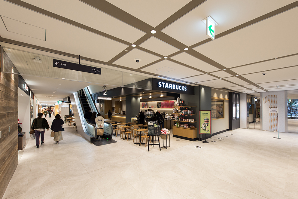 駅側の「うみ館」、まち側の「やま館」ふたつのにぎわいの場をつくり、多くの人が集まる空間を設えた。路沿いに様々な用途が顔を現すことで、商店街からの人の流れを自然に建物内に引き込む、商店街と一体のまちづくりを目指した。