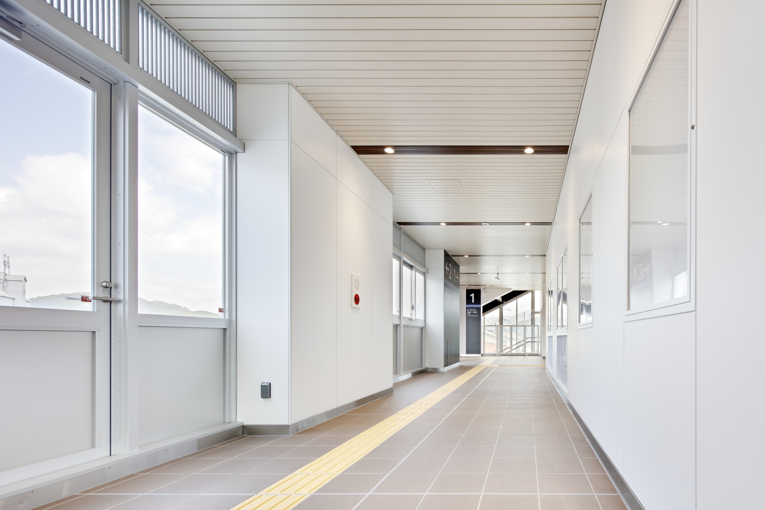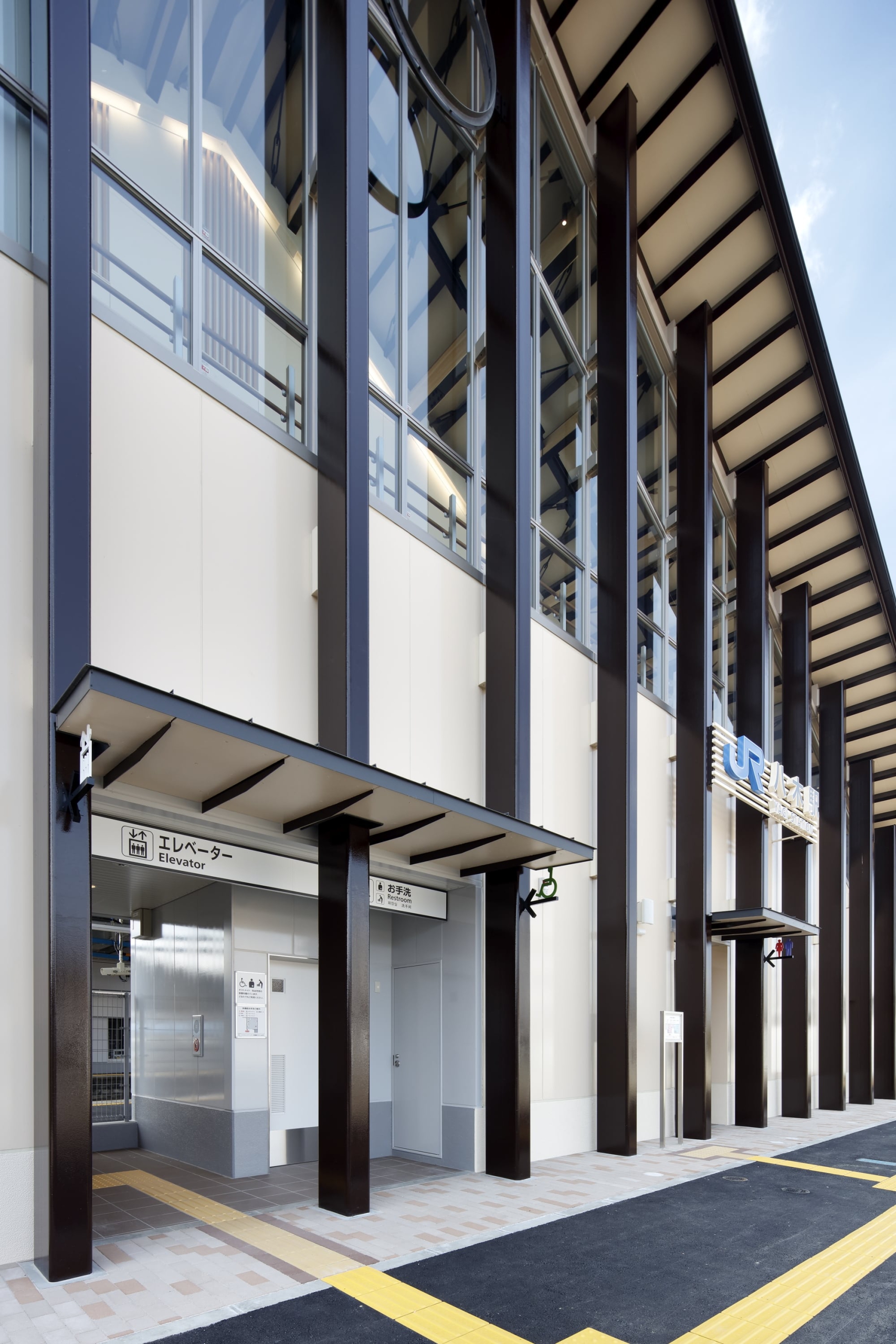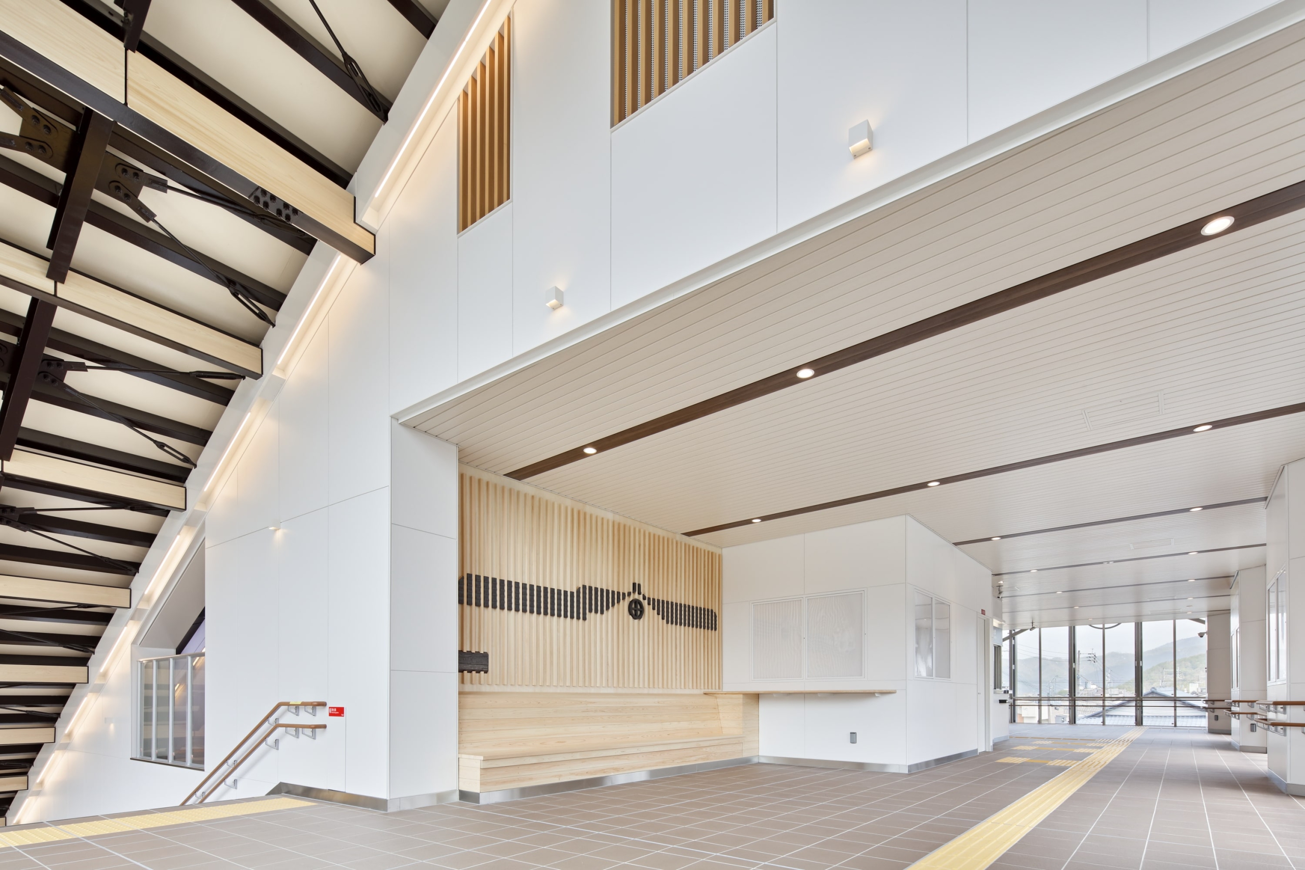 BF未整備で東西の行き来が出来なかった駅を、EVが設置された自由通路及び橋上駅に新築移転し、駅の利便性向上・利用促進を図った。山並みを表現した勾配屋根や、地域のシンボルである橋を構造体で表現し、周辺と調和するようなデザインとした。旧駅舎の面影を、ファサードや待合スペースで表現し、地域の方々に愛される工夫を行った。