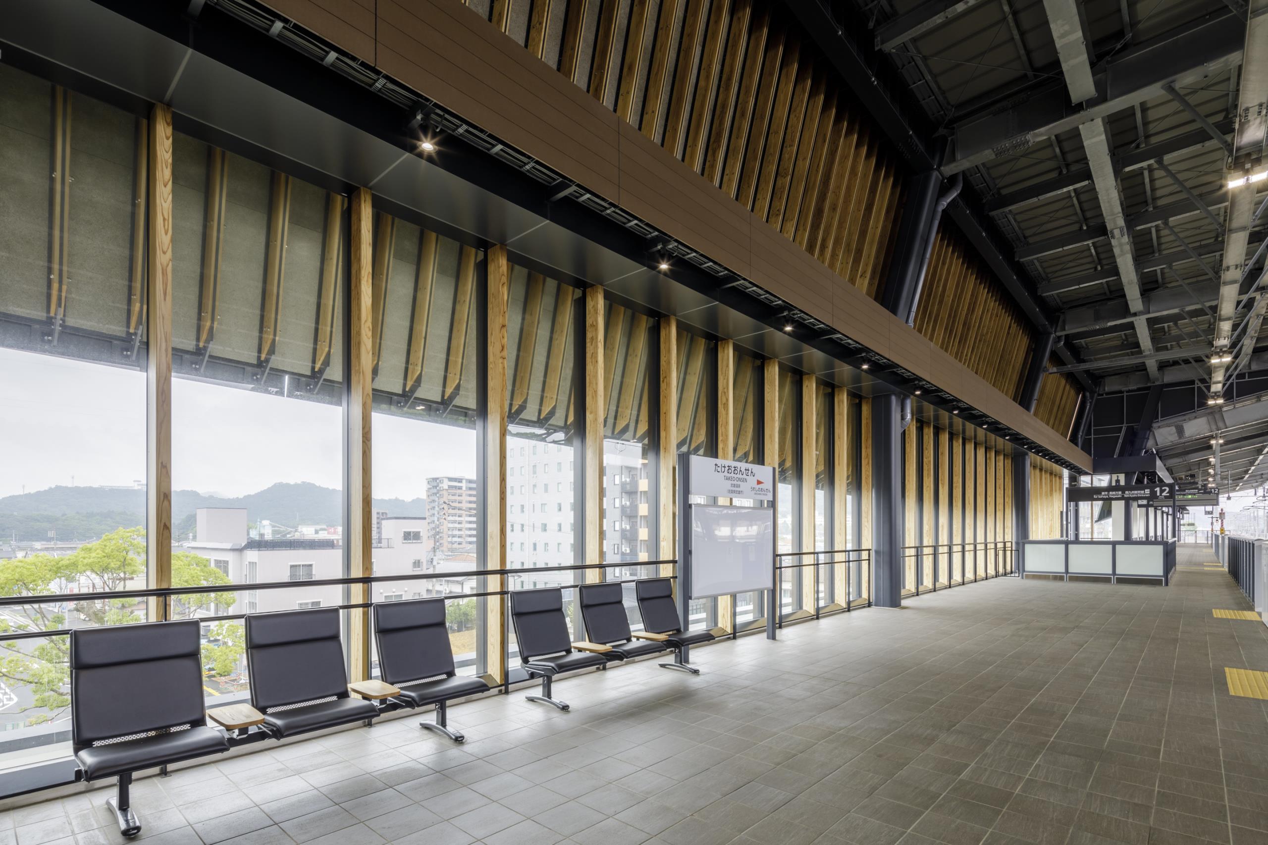 武雄の温泉街になじむよう、駅本屋の低層部を漆喰や赤い木組をイメージした外装とし、ダイナミックな大屋根をかけ現代的な表現とした。