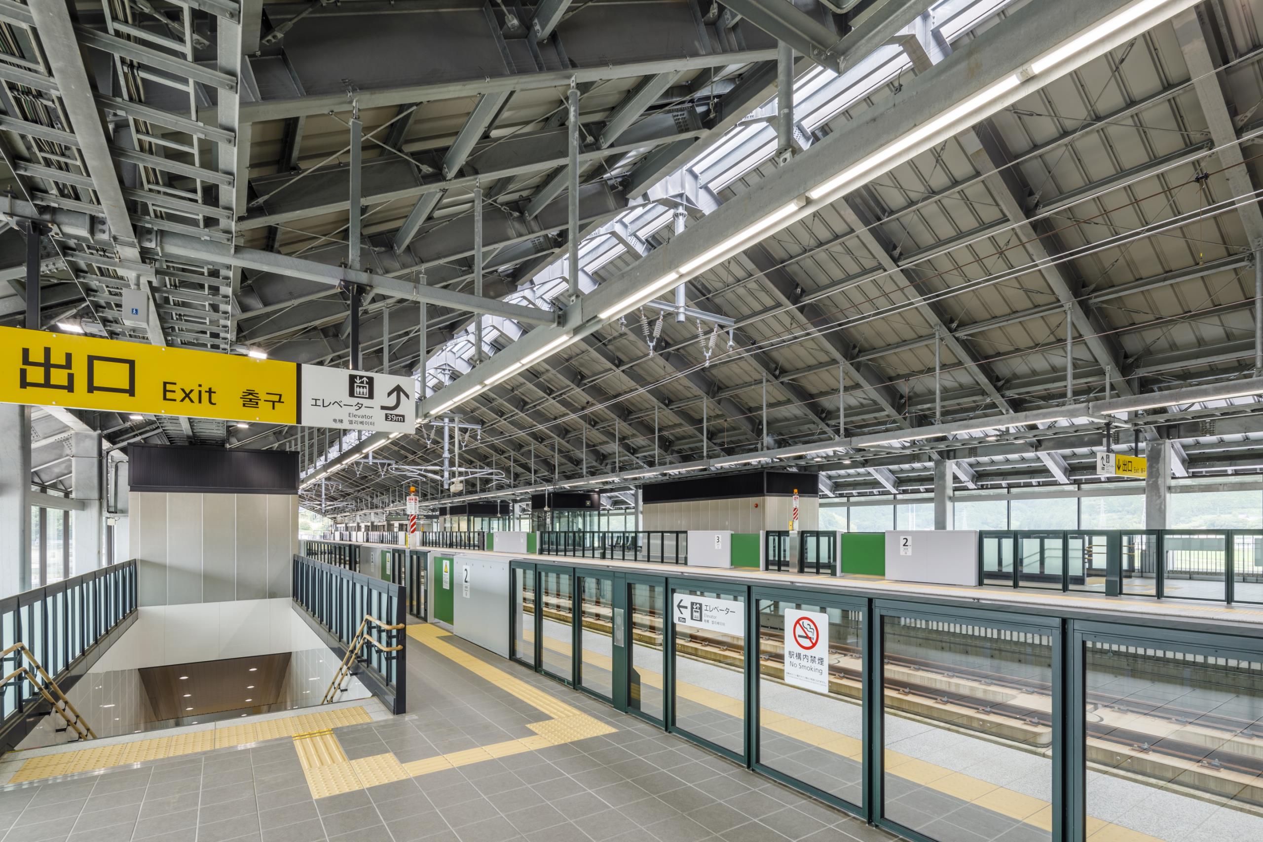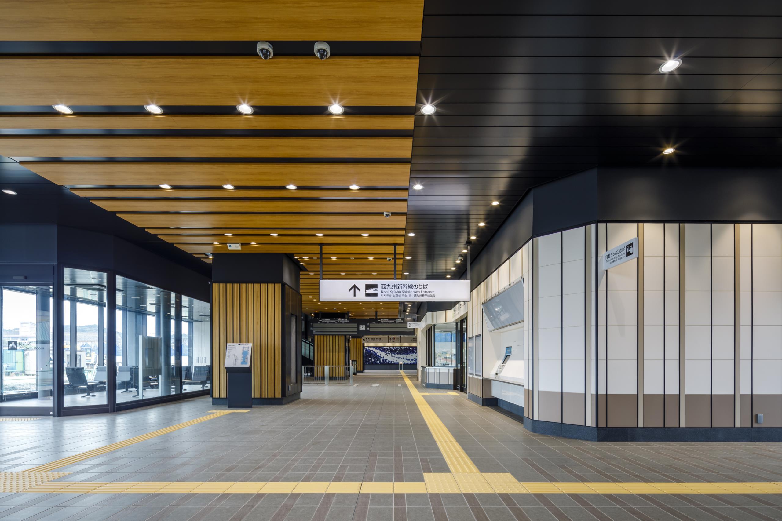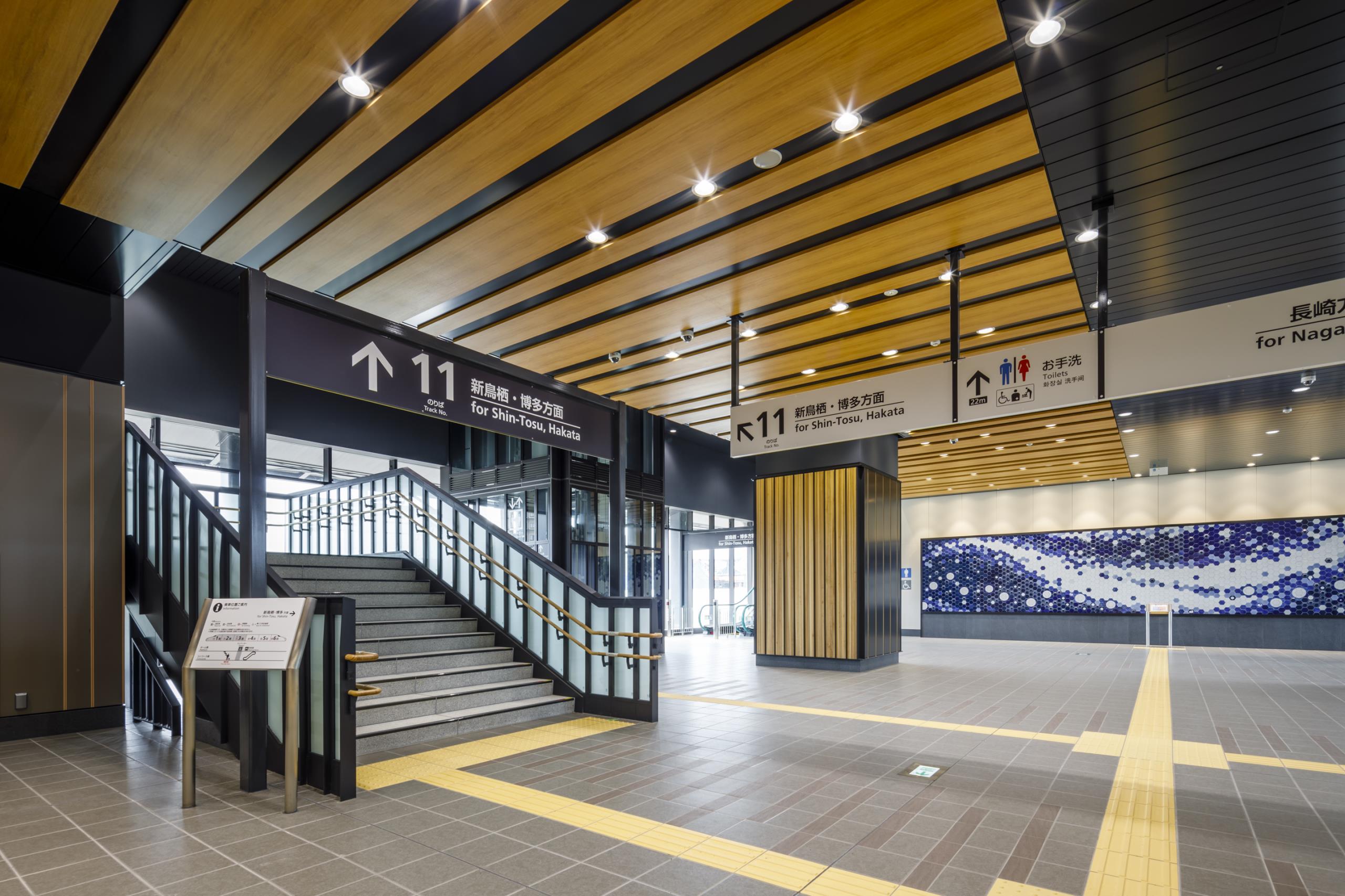 内装に市民協働企画で地元市民が彫刻した肥前吉田焼タイルや地元産木材を活用したり、福祉団体とUD意見交換会を開催したりと、市民との協働により地域に愛される駅を目指した。