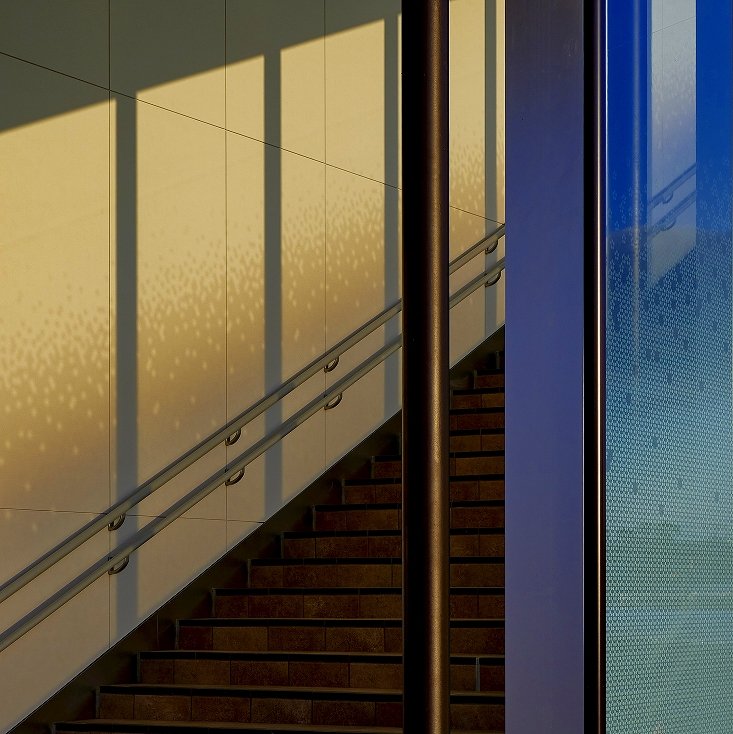 - 特徴的な仕上げ材屋根:金属屋根 縦葺き ラジアルーフ(元旦ビューティー工業) / 外壁:押出成形セメント板 アスロック(ノザワ) / 建具:カーテンウォール SR-GARELIA(不二サッシ) / 天井:アルミスパンドレル MR-91(森村金属) / 壁:化粧ケイカル DIC フネン(DIC) / 床:磁器質タイルMAR-2(クリヤマ)、KHSP/SK4(クリヤマ)