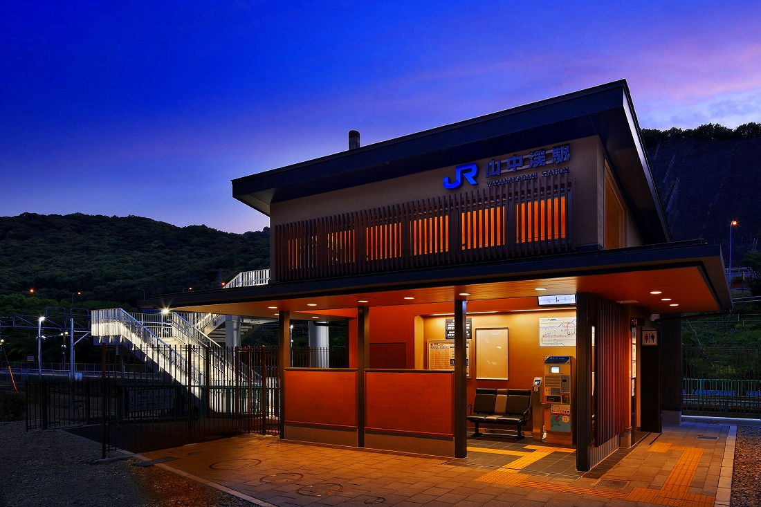 山中渓駅は旧宿場町の桜の名所にある無人駅です。今回駅前面の道路拡幅に伴い、駅全体のリニューアル工事を実施しました。老朽化していた駅舎・トイレの建替およびこ線橋の改修を行い、きれいで明るく使いやすい施設に生まれ変わりました。歴史的町並みに溶け込むファサードやバリアフリートイレの整備など地域に愛される駅舎を目指しました。