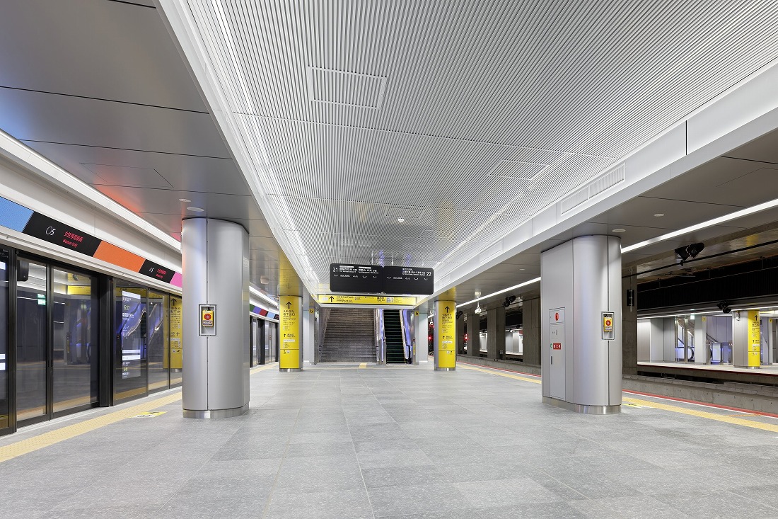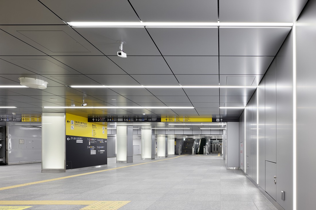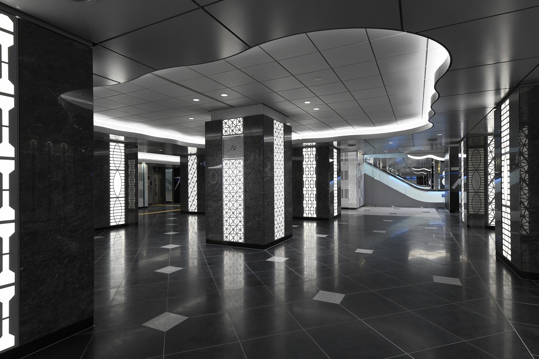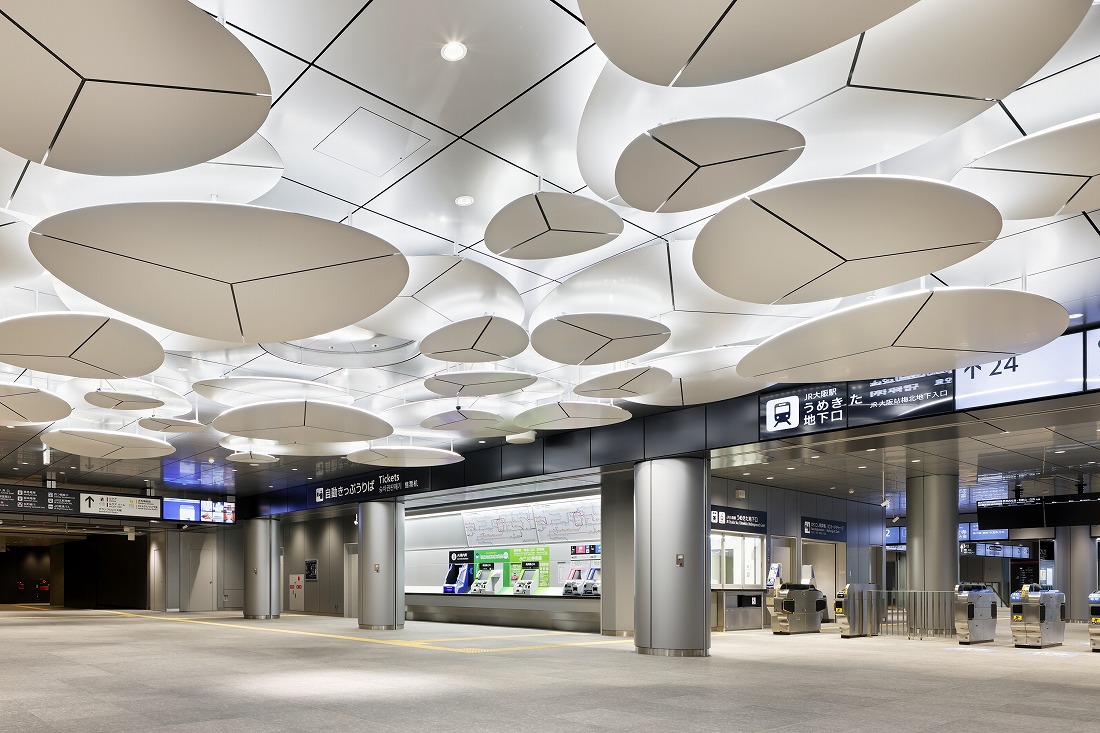 うめきた地下口:RC造 / 地下2階,地上1階 / 5,356.44㎡ - 特徴的な仕上げ材屋根:膜屋根(太陽工業) / 建具:三和シャッター / セントラルガラス販売 / 大阪フジサービス / 天井:アルミスパンドレル(RIKEN) / 壁・床:石関ケ原石材 / タイル(LIXIL)