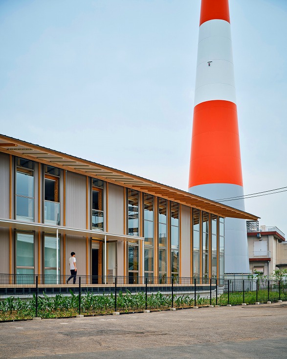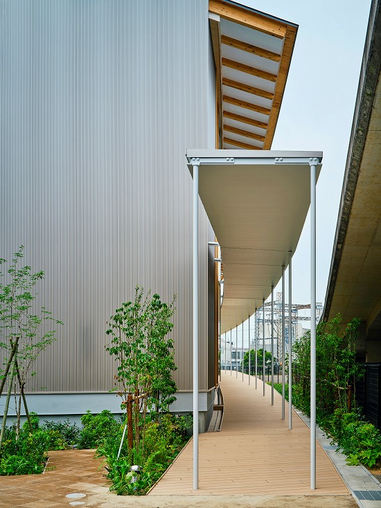 敷地は東西を高架に塞がれた袋小路になっている。名古屋駅からは電車で 5 分と好立地ながら、工事用の資材置き場となっていた、茫漠とした都市インフラによるデッドスペースとも言える空間に、新たに木造二階建てのオフィスを建てることで、人の居場所を都市の裏につくりだすことを意図している。
