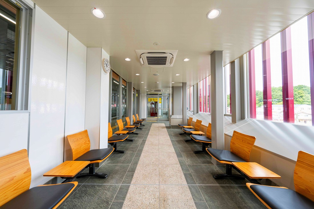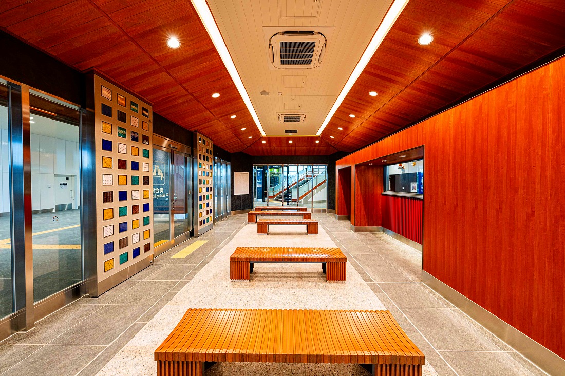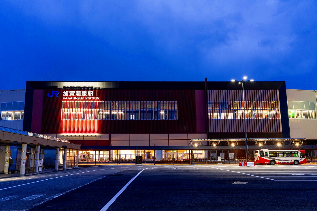 加賀温泉駅は県南温泉街への玄関口であり、南口駅前広場に旅館送迎バスが待機できる大型駐車場が整備されている。また北側に併設する在来駅には柵外コンコースに併設した通路から乗換えが可能となっている。デザインとしては、紅殻格子をイメージした縦ルーバー、赤瓦や県産木材を活用し、風情と歴史と感じさせ、地域に愛される駅を目指した。