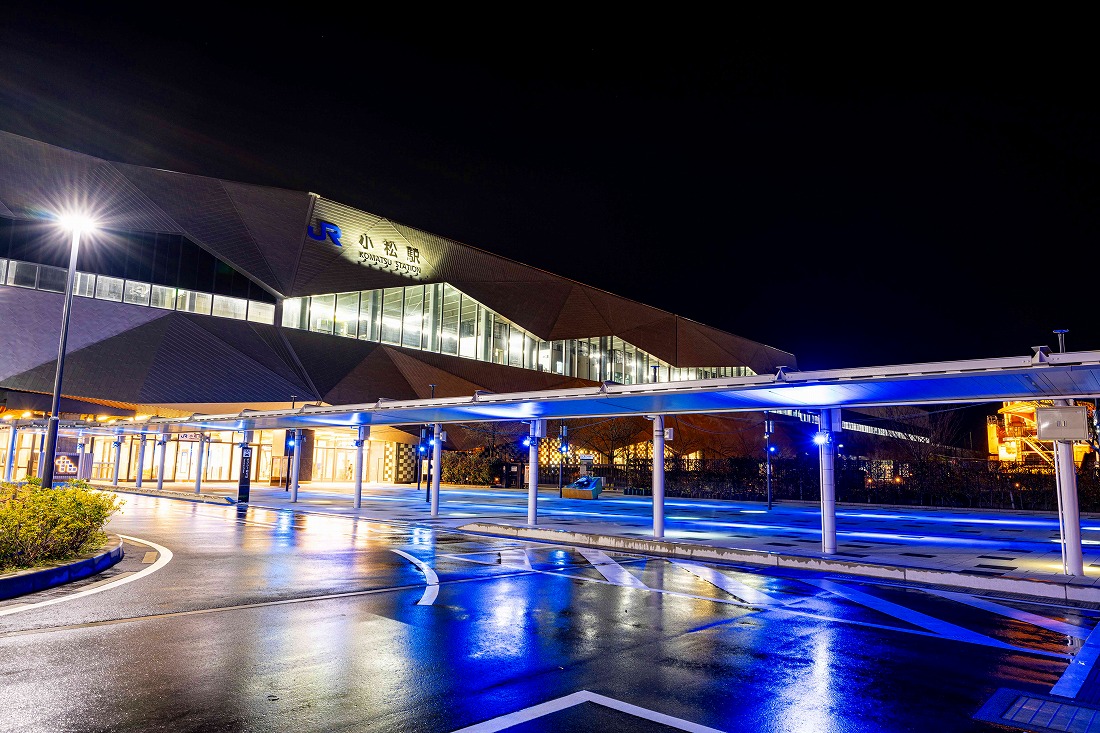小松駅の西に日本海、東に白山が位置し、小松空港の空路、北陸自動車道、国道の陸路、在来線の鉄道が近接しており、交通・産業・観光において拠点となるターミナル駅と考えている。外観の金属パネルや中央の開口部で白山の山並みを表現しており、内装材に木材・石材の地場産材を活用し、小松の歴史と未来との融合をイメージしている。
