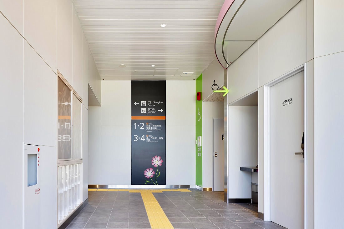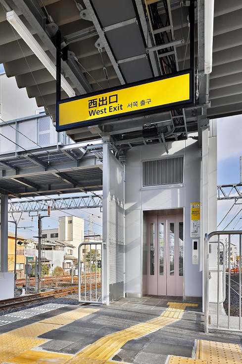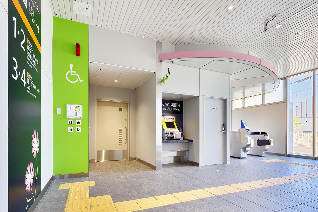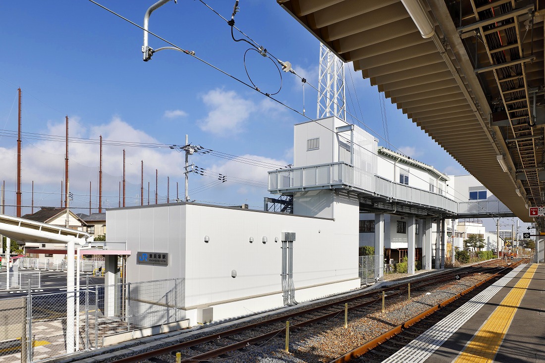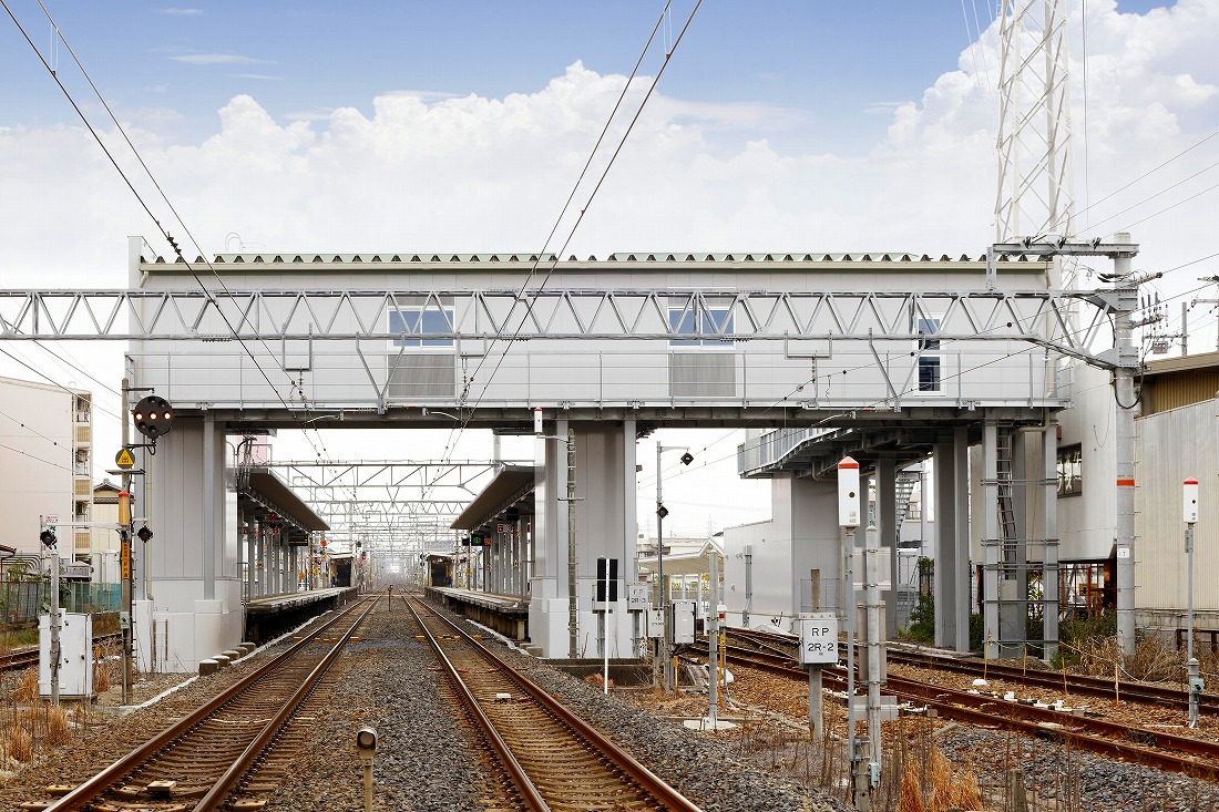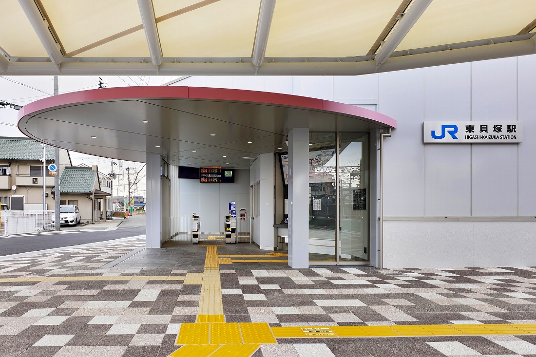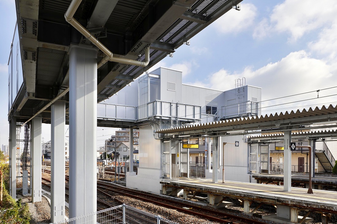 東貝塚駅は地下道を介して階段でホームに接続しているバリアフリー未整備の駅であった。ホーム幅員が狭くEVシャフトをホーム上に設けられないこと、周辺にも敷地の余裕がないこと等からバリアフリー設備の整備困難駅となっていた。これらの課題を解決し、EV付こ線橋及びこれにつながる新駅舎を整備することで、バリアフリー化を実施した。