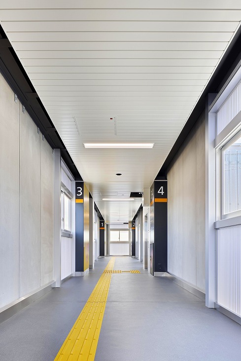 - 特徴的な仕上げ材屋根:淀工業(株);角ハゼ500;カラーガルバリウム鋼板折板 / 外壁:(株)ノザワ;ECP フッ素樹脂塗装 t=60 / 建具:(株)プログレスAN;MORANTO AM-S70 開口率70%;縦型防水ガラリ / 天井:森村金属(株);MR-91;アルミスパンドレル0.6t / 製作物アルミパネル / 壁:DICデコール(株);DICフネンS80 D-081M;化粧せっこうボード / (株)ノザワ;ECP フッ素樹脂塗装 t=60; / 床:(株)アイコットリョーワ;カリラ CA-300;磁器質タイル