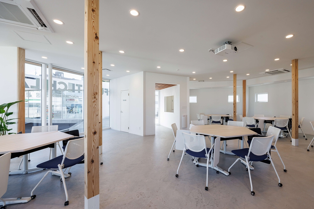 - 特徴的な仕上げ材建具:三協立山(株);東海道新幹線再生アルミを使ったカーテンウォール / 天井:大建工業(株);グラビオルーバーUS ボルト固定式 新幹線再生アルミ芯タイプ(さがみはら津久井産材)/ 壁:SUS(株);東海道新幹線再生アルミを使った意匠柱 / (株)長谷川萬治商店;木ダボ接合積層材(さがみはら津久井産材)