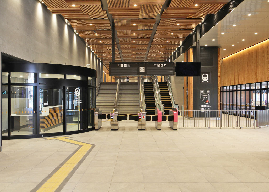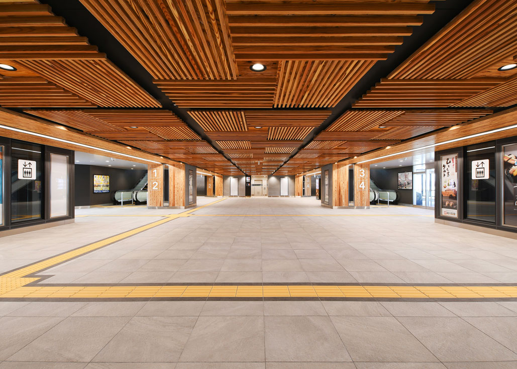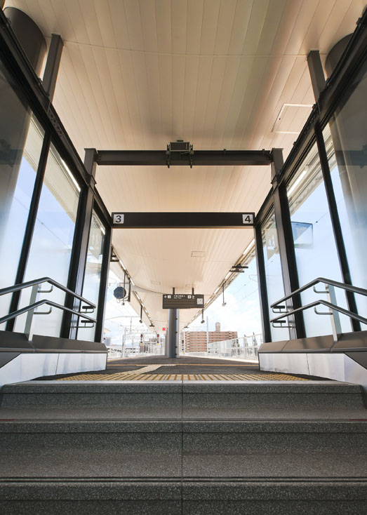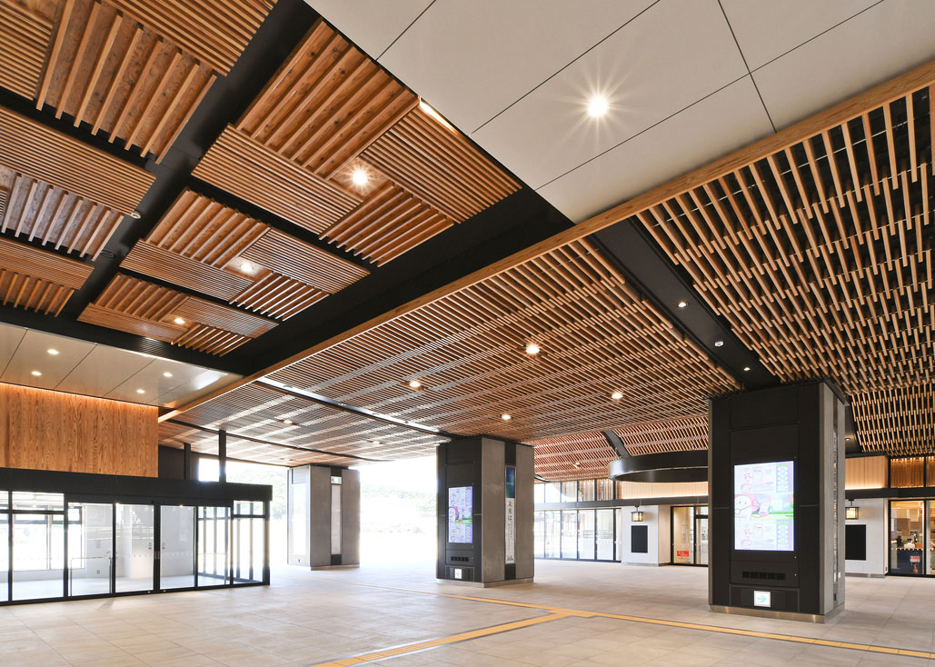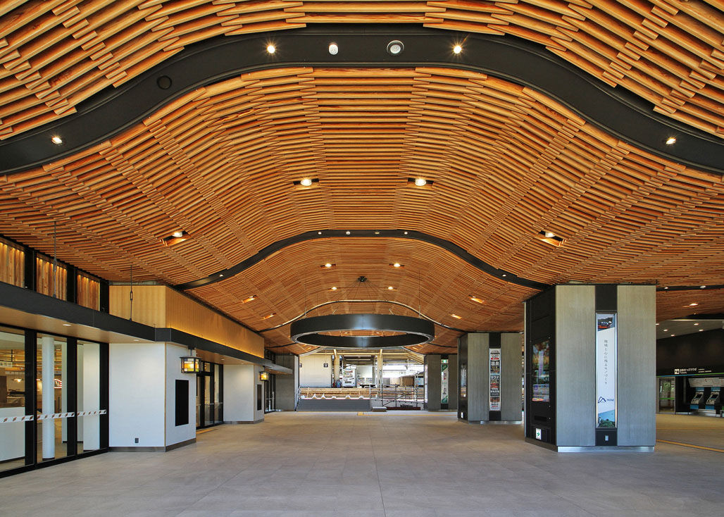 愛媛県松山市に位置するJR松山駅では、鉄道高架化に併せたバリアフリー化により、安全・快適な施設利用と駅機能強化を図るべく新駅舎整備を行った。何年先も愛され誇れる駅舎となることを願い、「培われた歴史・文化を未来に架けるシティゲート」をコンセプトに、県産木材や伝統工芸等の地域素材を積極的に活用した空間を作り上げた。