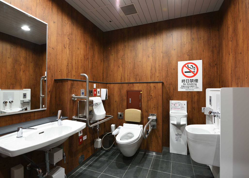• 特徴的な仕上げ材外壁:メーカー名;ダイナワン、品名;ETIC(外装タイル)/建具:メーカー名;不二サッシ、品名;アルミ製トップライト/天井:メーカー名;アサヒ金属 品名;アサヒスパンドレル メーカー名;3M、品名;3Mダイノックフィルム(スパンドレルシート)/壁:メーカー名;ニチアス 品名;アスラックス(化粧けい酸カルシウム板)、メーカー名;アイカ工業 品名;メラミン化粧板、メーカー名;3M、品名;3Mダイノックフィルム/床:メーカー名;エービーシー商会 品名;フェロコン・カラークリート(無機質系塗床)、メーカー名;安藤大理石 品名;花崗岩・磁器質タイル(乗降場)、メーカー名;INAX 品名;磁器質タイル(一般トイレ・バリアフリートイレ)