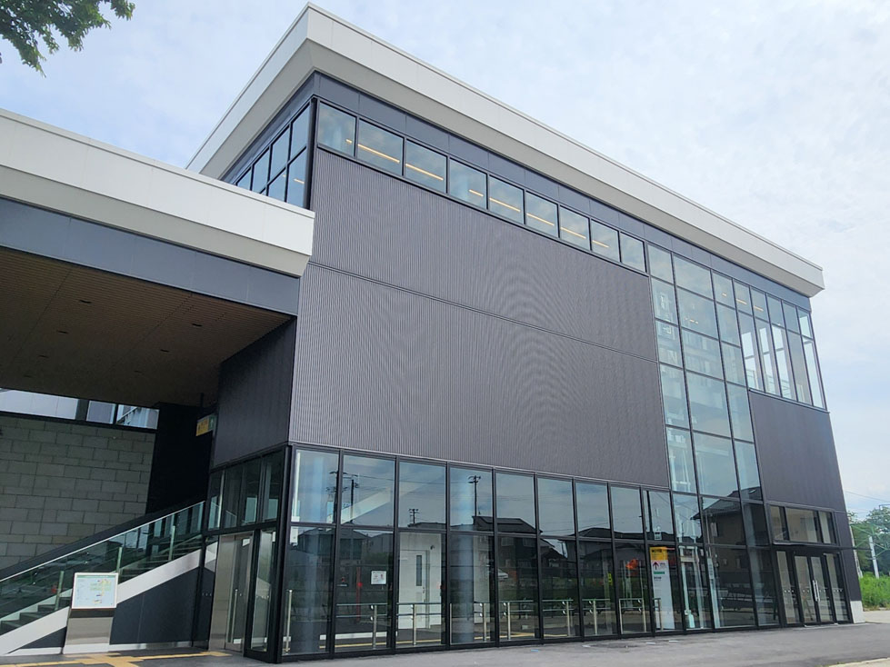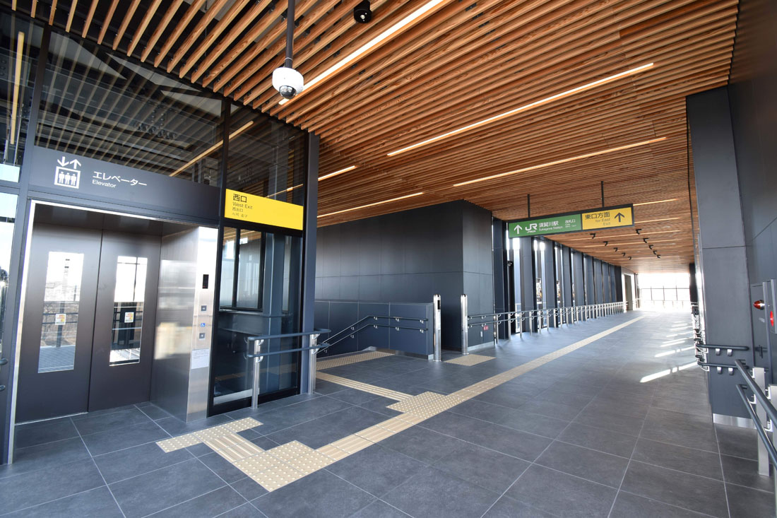 東口の旧駅舎の隣に自由通路と新駅舎と整備。旧駅舎は新駅舎開業後に改修して利活用され、新たつながる西口には広場が整備される。上りエスカレーターを備えた自由通路「あかりのみち」には、須賀川の伝統・文化である松明あかしや花火大会のハレと、送迎を待つ駅利用者の日常のケを表現。地場の木材・石材を用いて須賀川の魅力発信を図った。