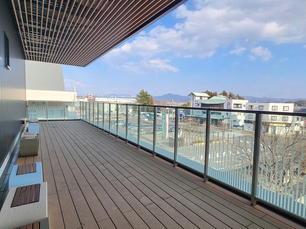 - 特徴的な仕上げ材屋根:品名;ALC/外壁:メーカー;アイジー工場、品名;ガルスパン、/メーカー;ノザワ、品名;アスロック/江持石/建具:メーカー;LIXIL 品名;アルミカーテンウォール/天井:福島産材 準不燃木ルーバー(杉)/壁:メーカー;エーアンドエーマテリアル 品名;ステンド#400/床:メーカー;LIXIL 品名;メンフィス