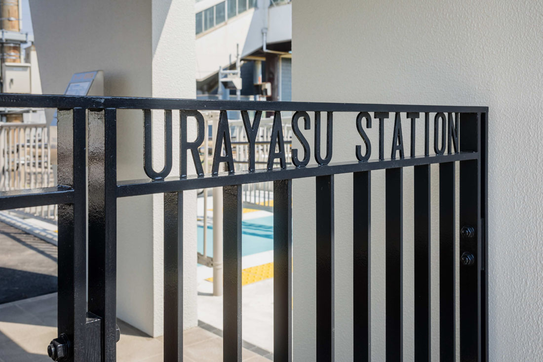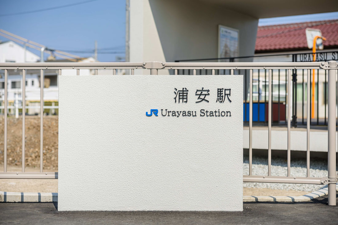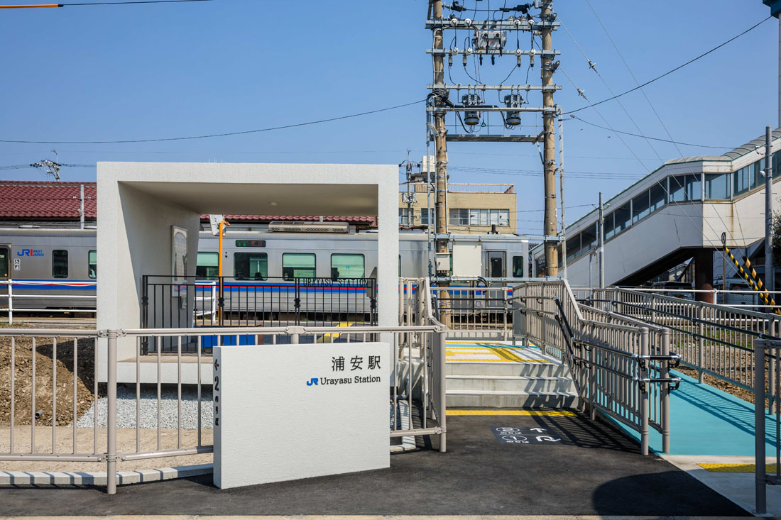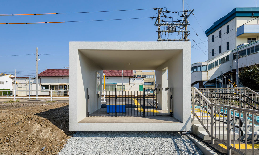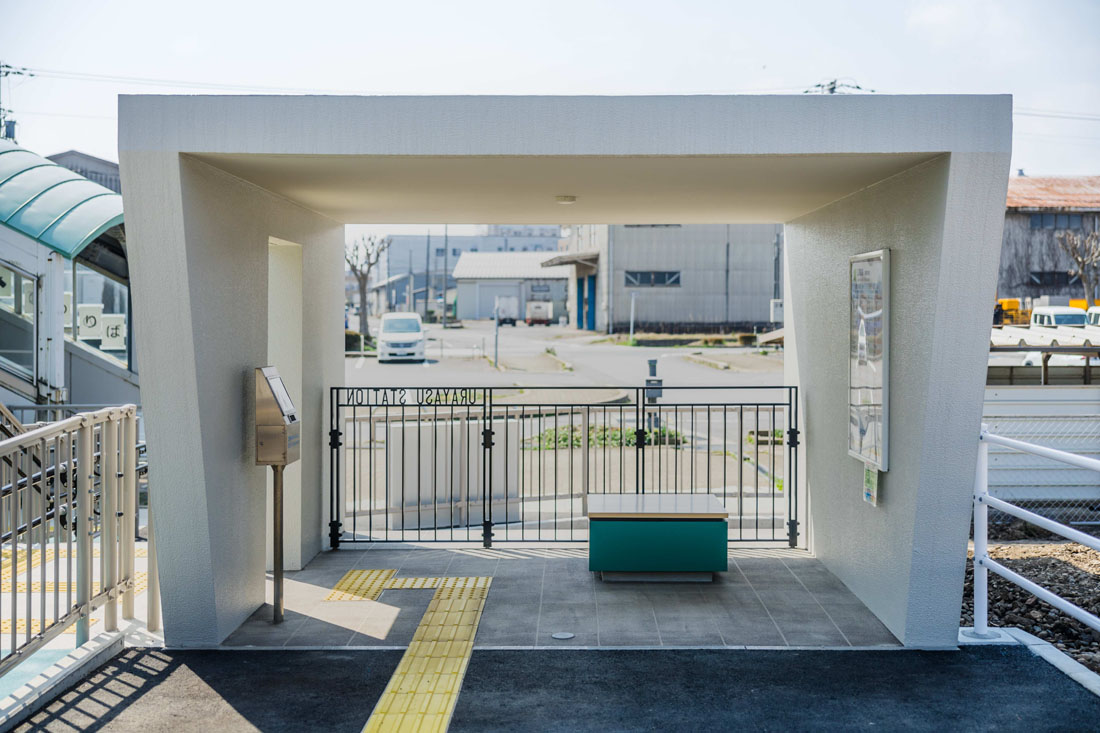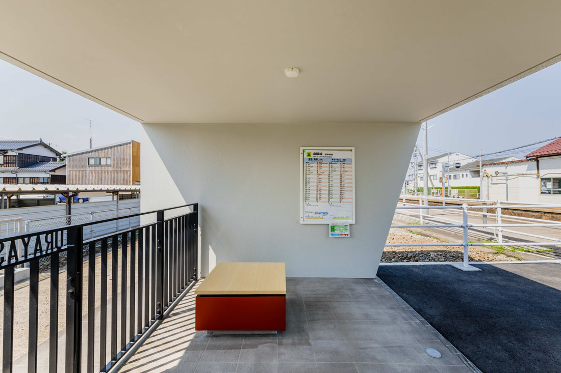 高低差のある既存敷地に対し、その敷地でしか成立しえないデザインとすることで、周辺環境に馴染むよう設計を行いました。また、裏口駅舎として誕生した本建物ですが、列車を見通すことのできる形状により建物自体がサイン効果を持っています。室内に設置したベンチはシンプルな形状ながら4色のカラーリングを施してあり、存在感を放ちます。