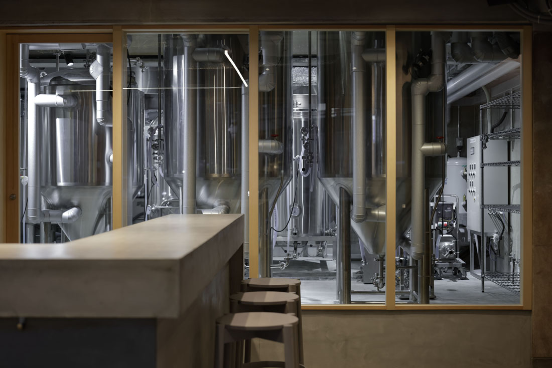 JR西日本グループ企業が新規事業として始めたクラフトビール事業の実店舗、タップルーム併設の醸造所。高架下に位置し様々な条件や制約がある中、意匠・レイアウトはなるべく少ない手数で構成・整理することを検討した。カウンターを通りに正対して設け、ファサードは街に大きく開くことで、にぎわい創出への貢献や地域共生の実現を目指した。