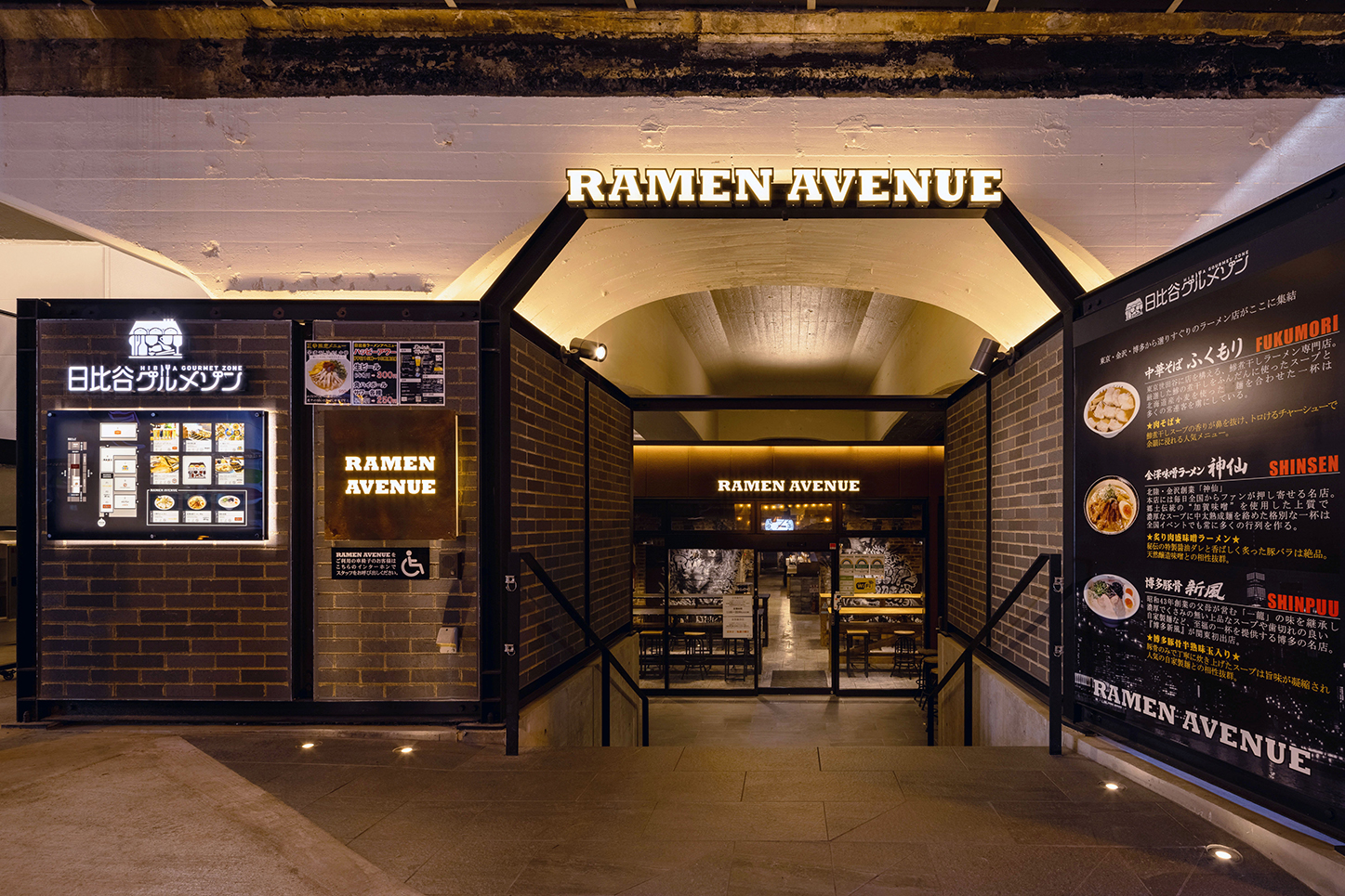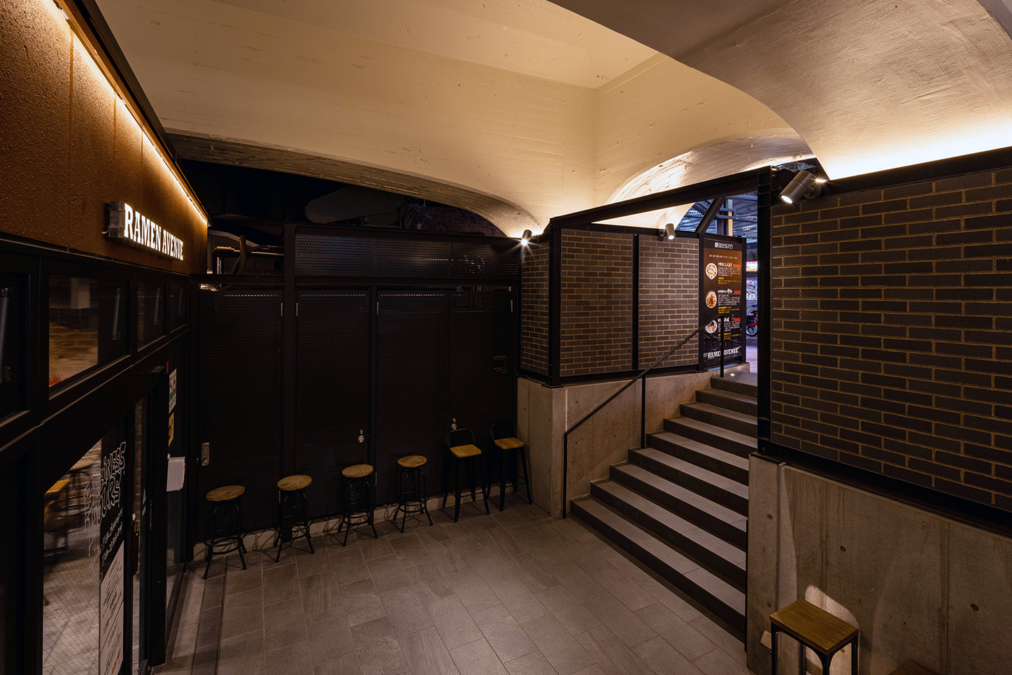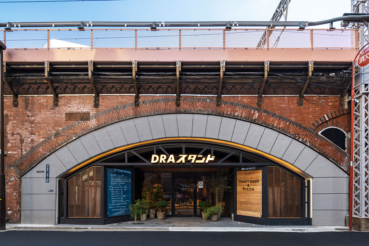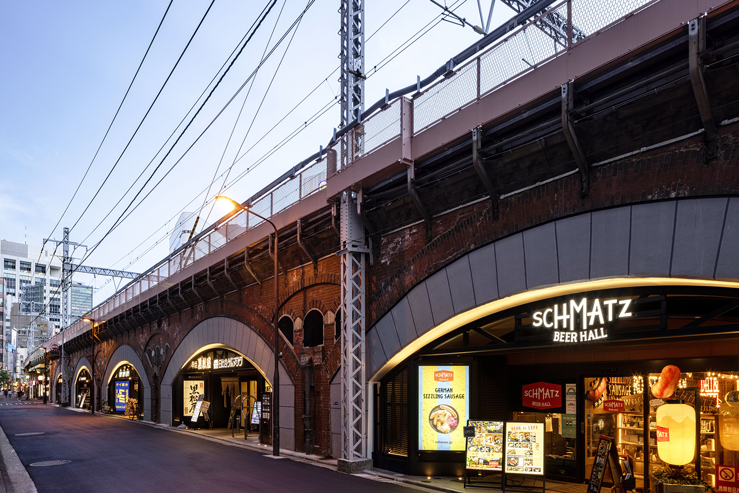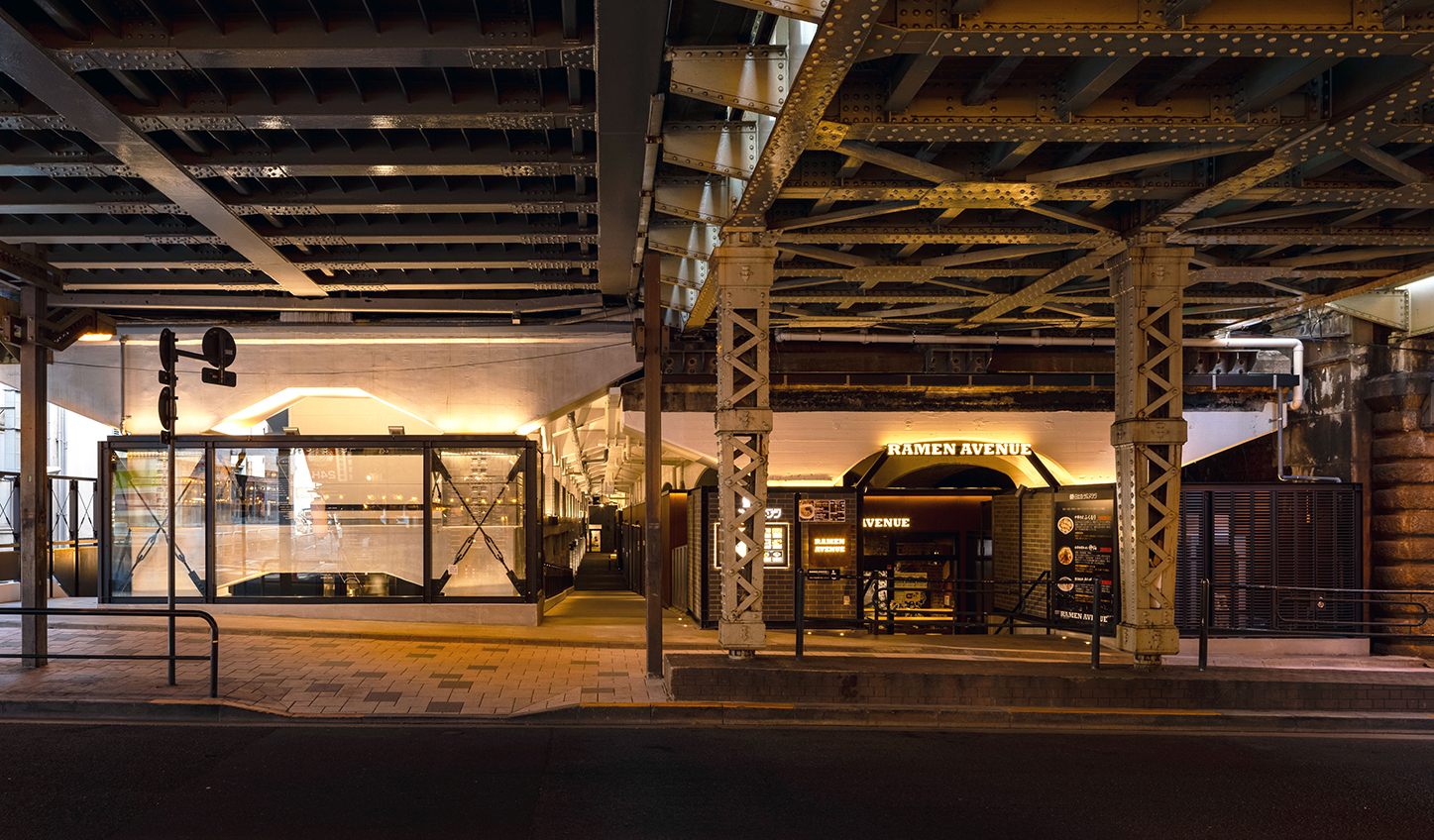 100年の歴史あるレンガアーチ高架橋との調和と対比をコンセプトに、鉄骨トラスフレームやサイン壁、土木躯体のライトアップ等により、特徴的な外観を形成した。外構の一部に新幹線再生アルミを使用し、環境にも配慮。JR東海とJR東日本の協業により、周辺地域に新たな商空間を提供する高架下施設となっている。