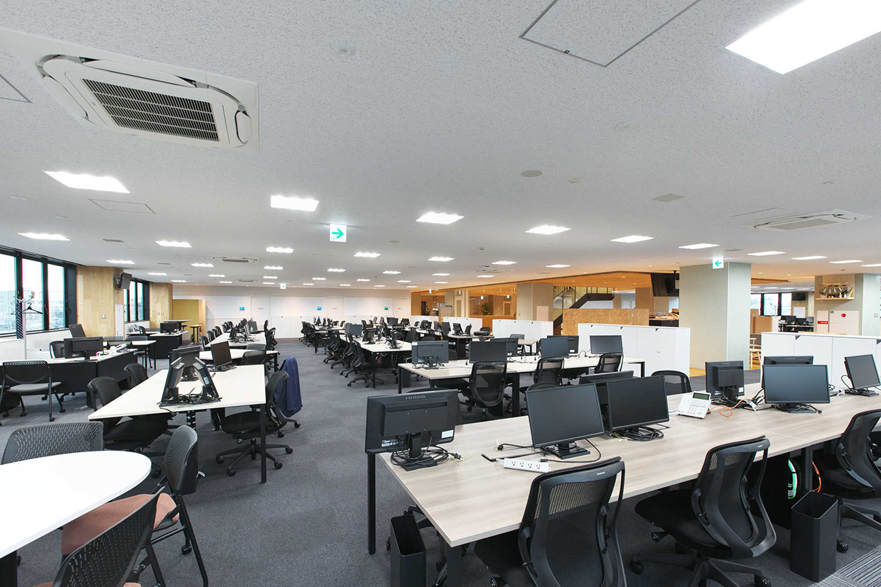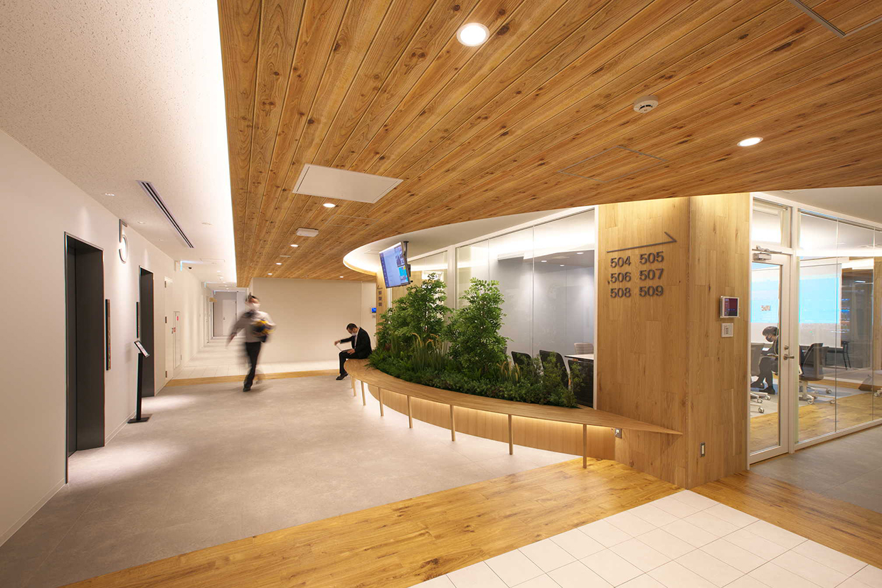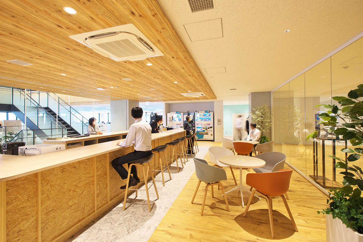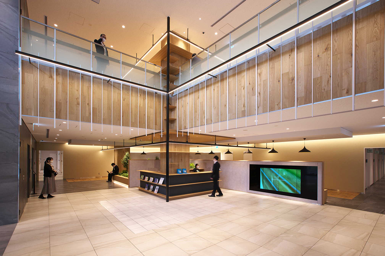 「結び拓くワークプレイス」というコンセプトのもと、社員が働きやすくフレキシブルなワークスタイルを可能にする新支社ビルを目指した。空間的なつながりで明るく開放的なエントランスに加え、6階~8階の中心に設けた執務室内階段が最大の特徴。木目調を多用した内装デザインをベースに、建物内の随所に新潟らしさを施している。